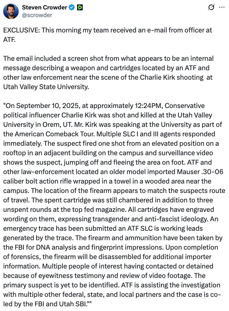 Dr. Peter McCullough MD - Sep 12th 2025 12:31am EDT As I noted in an earlier post, it strikes me as odd that the shooter would flee from his rooftop sniper perch WITH HIS RIFLE. This seems especially strange, given that he purportedly later ditched the weapon “in a wooded area, wrapped in a towel, with three unspent cartridges in the magazine, engraved with wording […]