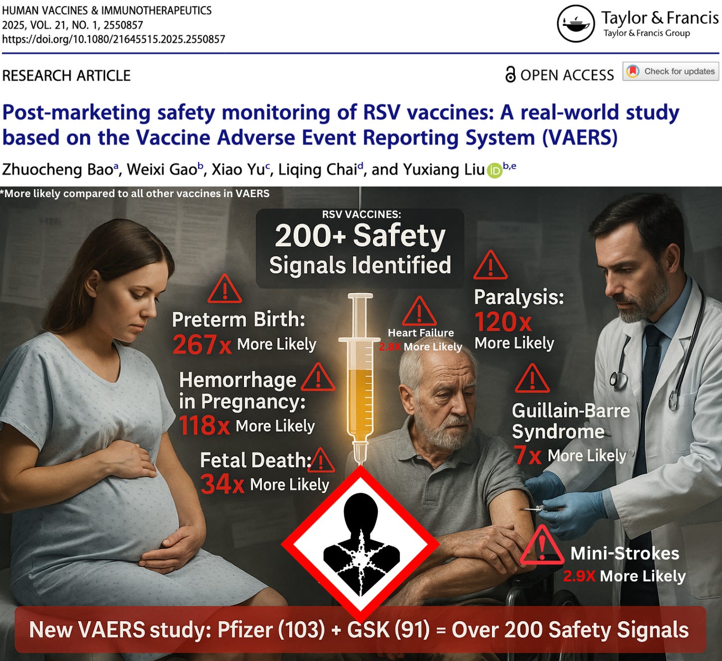 Dr. Peter McCullough MD - Sep 5th 2025 4:52pm EDT By Nicolas Hulscher, MPH A new peer-reviewed pharmacovigilance study just published in Human Vaccines & Immunotherapeutics analyzed nearly 18,000 adverse event reports tied to the three FDA-approved RSV vaccines — Pfizer’s Abrysvo, GSK’s Arexvy, and Moderna’s mRESVIA. The findings are alarming: Pfizer’s vaccine generated 103 positive safety signals, including fetal death, hemorrhage in pregnancy, and […]