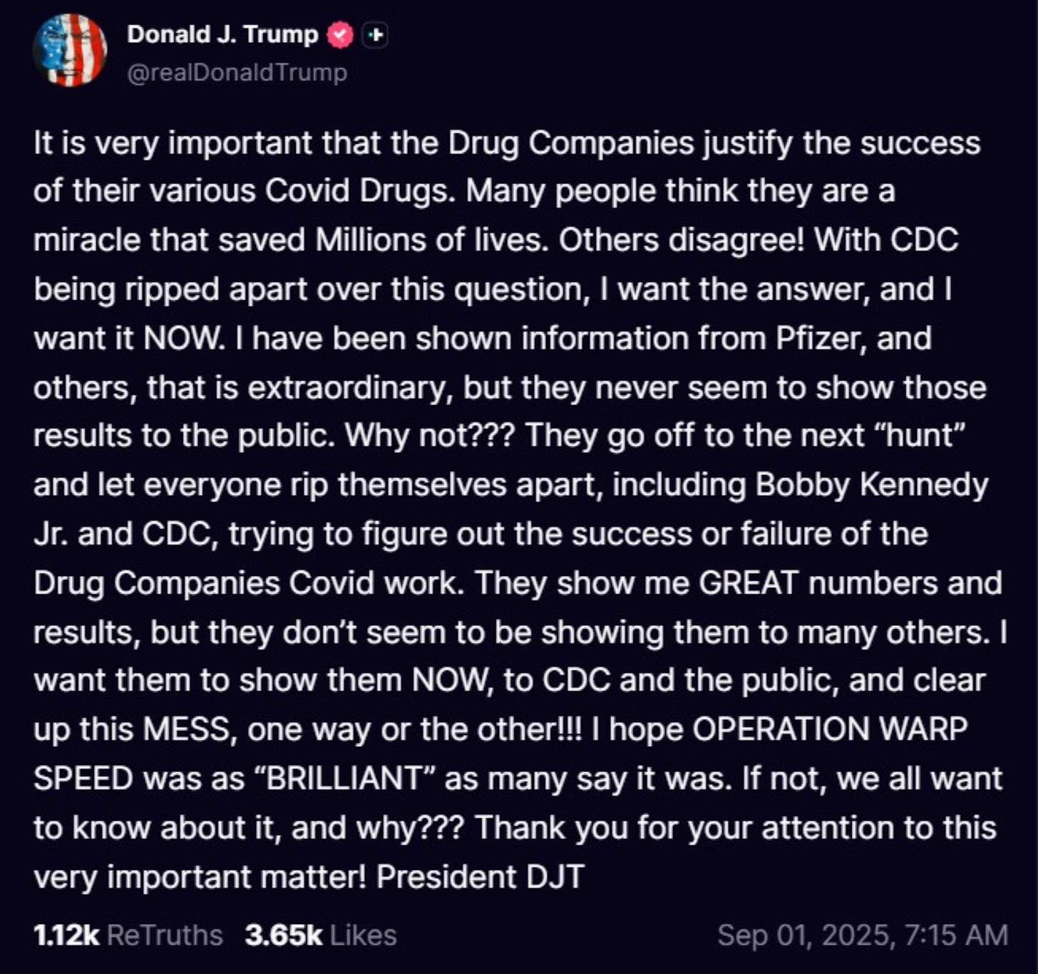 Dr. Peter McCullough MD - Sep 10th 2025 5:27am EDT By Peter A. McCullough, MD, MPH As Americans have endured record COVID-19 vaccine injuries, disabilities, and death with complete silence from Biden and Trump, many are wondering if POTUS has finally awaken with his September 1, 2025, Truth Social Post on vaccine drug companies. Dr. McCullough appeared on Stinchfield Tonight and told Grant Stinchfield that […]