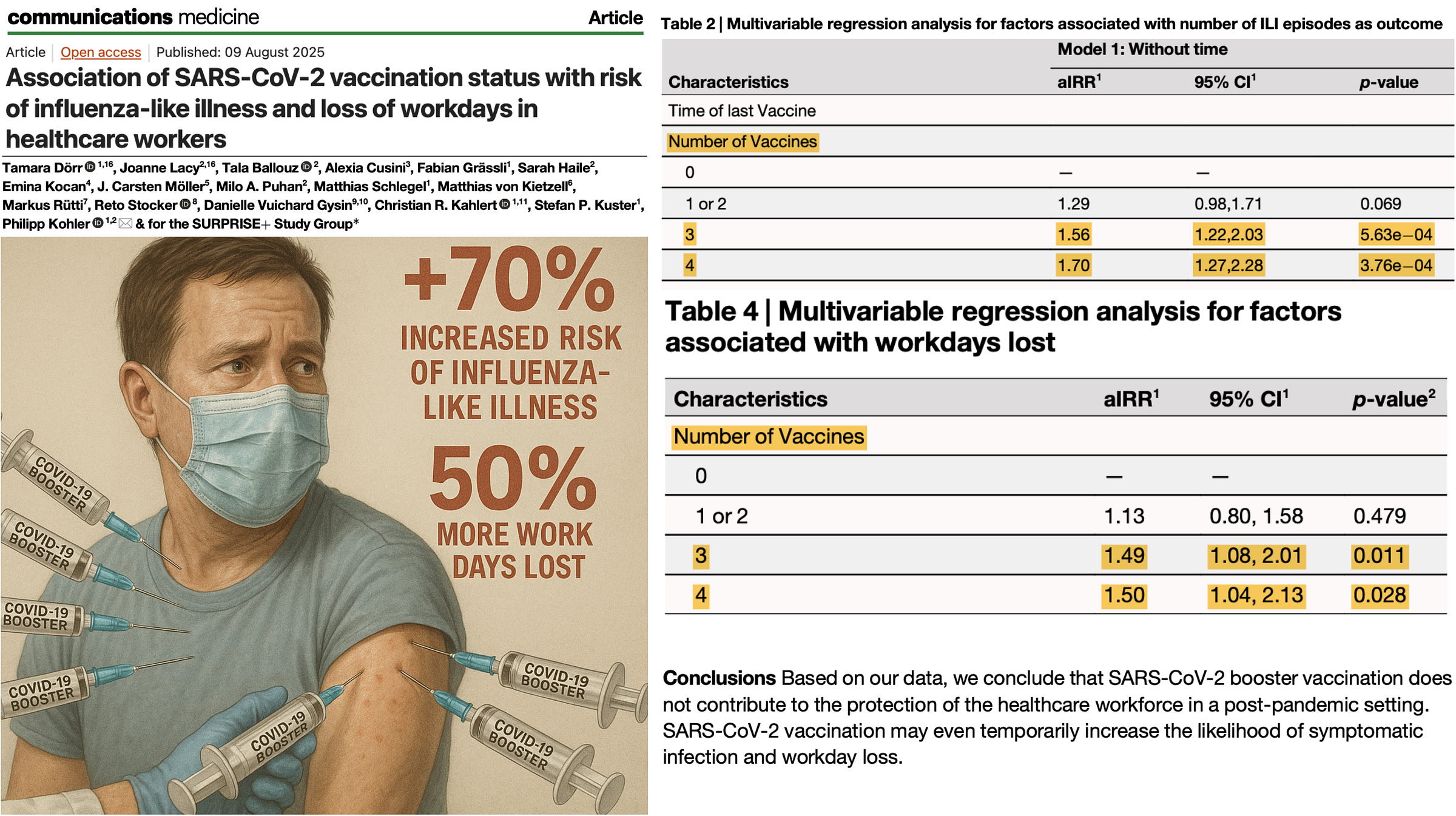 Dr. Peter McCullough MD - Aug 10th 2025 2:47pm EDT by Nicolas Hulscher, MPH A major Swiss study of 1,745 healthcare workers, published in Nature’s Communications Medicine, found that recent COVID-19 booster shots were linked to a significantly higher risk of illness and missed work compared to the unvaccinated. The illness measured was Influenza-Like Illness (ILI) — sudden onset of fever (≥38°C or feeling feverish) […]