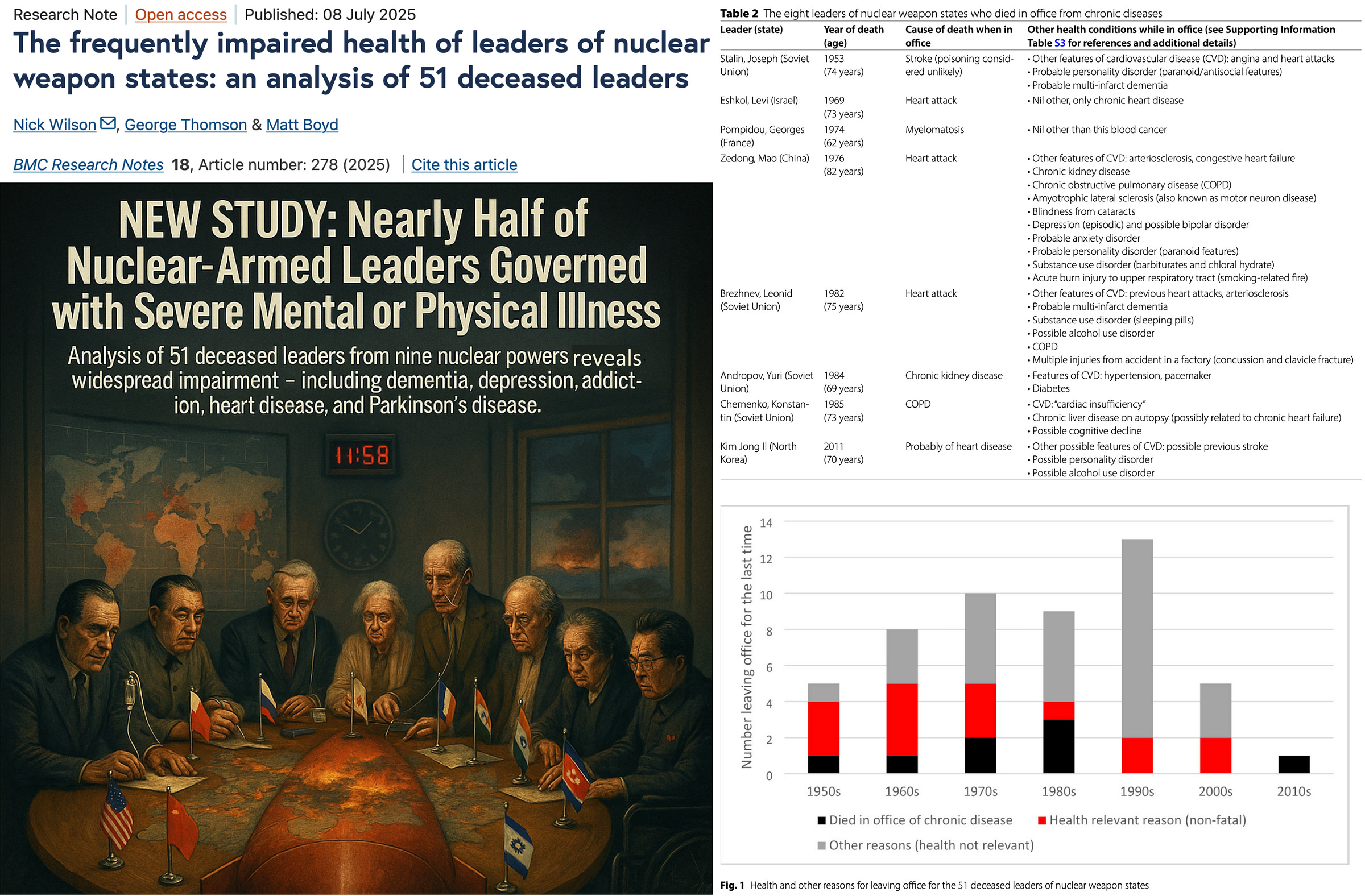 Dr. Peter McCullough MD - Jul 30th 2025 3:38pm EDT By Nicolas Hulscher, MPH A new peer‑reviewed study titled, The frequently impaired health of leaders of nuclear weapon states: an analysis of 51 deceased leaders, has revealed a chilling truth: 45% of past leaders of nuclear‑armed nations since the dawn of the atomic age had health conditions that could impair judgment — some while holding […]