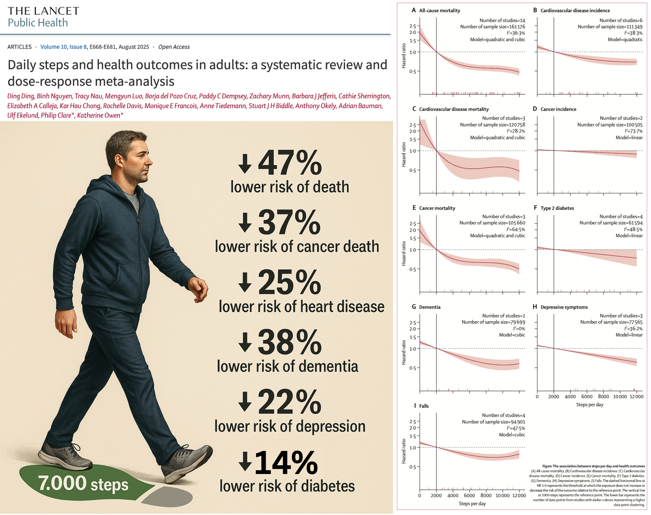 Dr. Peter McCullough MD - Aug 4th 2025 10:19am EDT by Nicolas Hulscher, MPH A new peer‑reviewed study titled, Daily steps and health outcomes in adults: a systematic review and dose-response meta-analysis, published in The Lancet Public Health, has delivered the most comprehensive answer yet to the question: How many steps a day do we really need for better health? This largest and most comprehensive […]