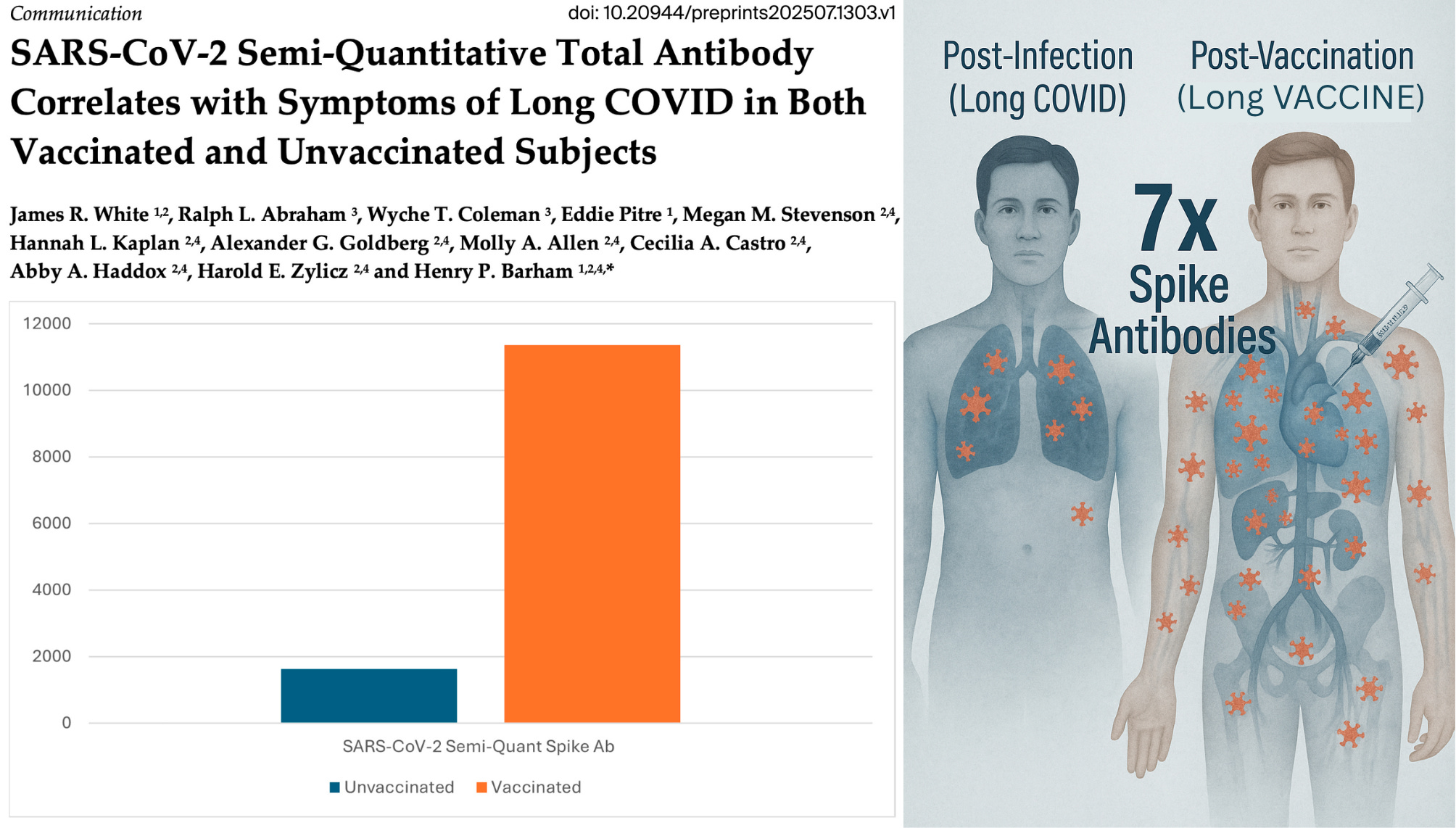 Dr. Peter McCullough MD - Jul 18th 2025 12:52pm EDT By Nicolas Hulscher, MPH A new Preprint study titled, SARS-CoV-2 Semi-Quantitative Total Antibody Correlates with Symptoms of Long COVID in Both Vaccinated and Unvaccinated Subjects, adds weight to the growing body of evidence suggesting that persistent spike protein underlies post-vaccination syndromes: Key Findings Study Population: • N = 100 total patients with chronic post-COVID-like symptoms• […]