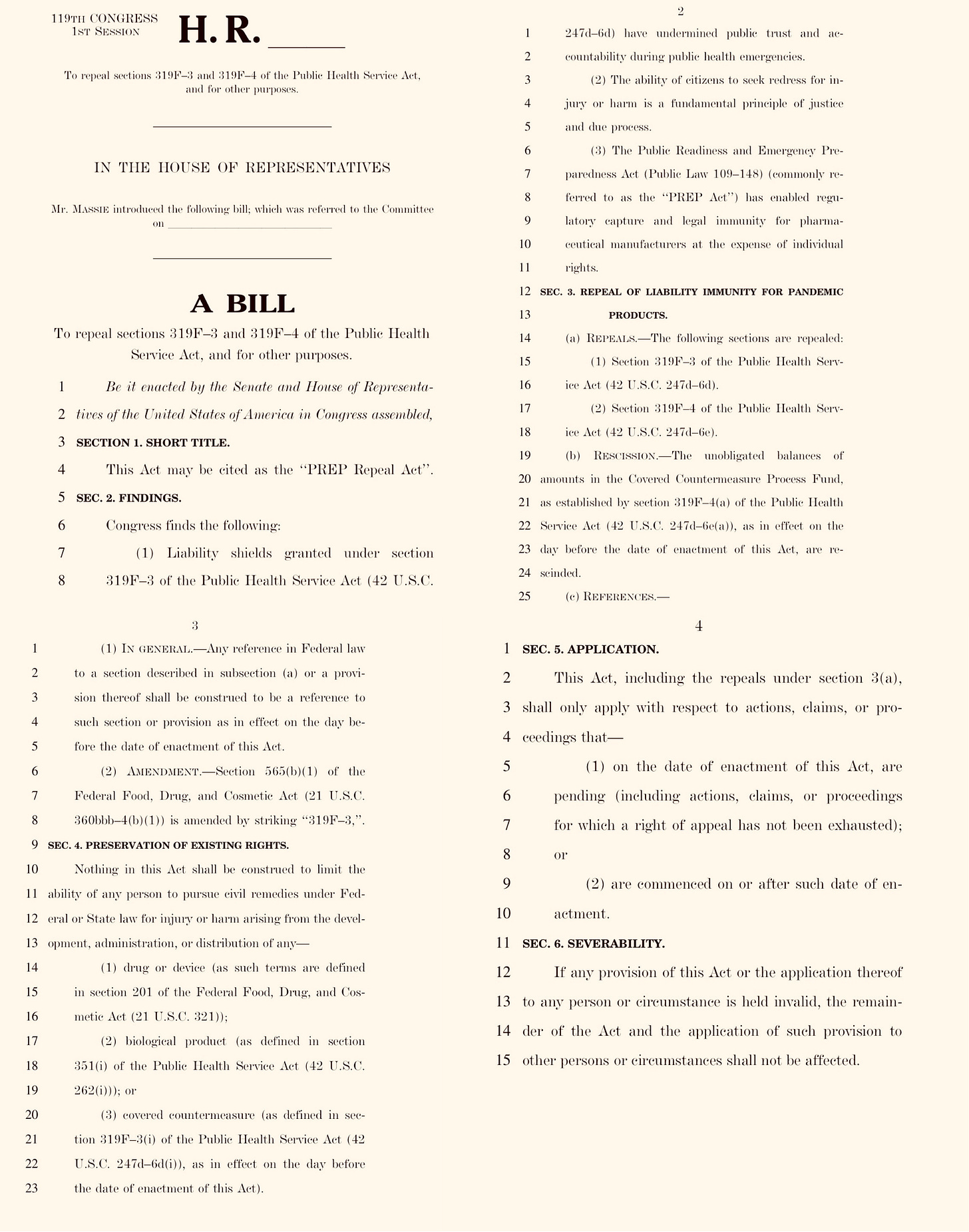 Dr. Peter McCullough MD - Jul 15th 2025 8:19pm EDT By Nicolas Hulscher, MPH Rep. Thomas Massie (R-KY) has introduced the PREP Repeal Act (H.R. 4388), a landmark piece of legislation that would fully repeal the Public Readiness and Emergency Preparedness (PREP) Act — the federal law that grants sweeping legal immunity to pharmaceutical companies for injuries caused by emergency medical countermeasures, including mRNA injections. […]