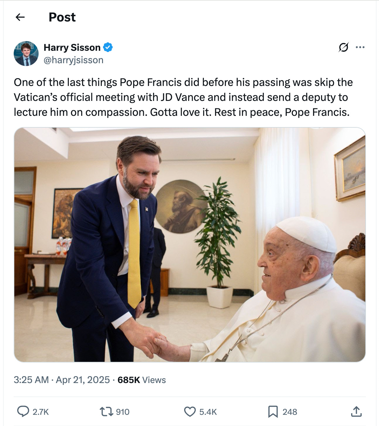 Dr. Peter McCullough MD - Apr 21st 2025 12:28pm EDT This morning in Rome, Cardinal Kevin Farrell, the Vatican camerlengo (office for announcing Pope’s death) declared from the chapel of the Domus Santa Marta, where Francis lived: At 7:35 this morning, the Bishop of Rome, Francis, returned to the house of the Father. His entire life was dedicated to the service of the Lord and […]