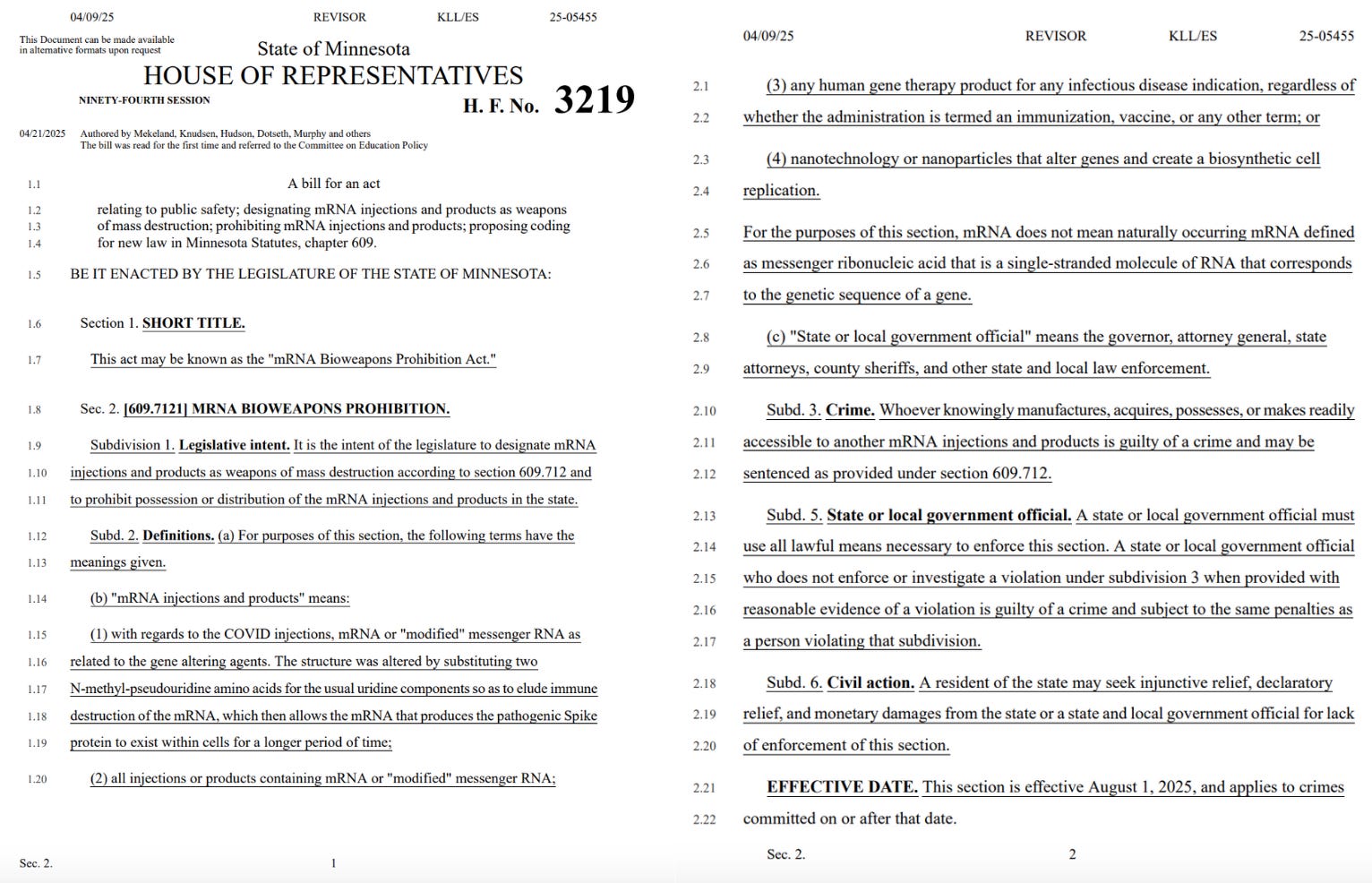 BREAKING — Minnesota Files Bill HF3219 to Designate mRNA Injections as Biological Weapons of Mass Destruction