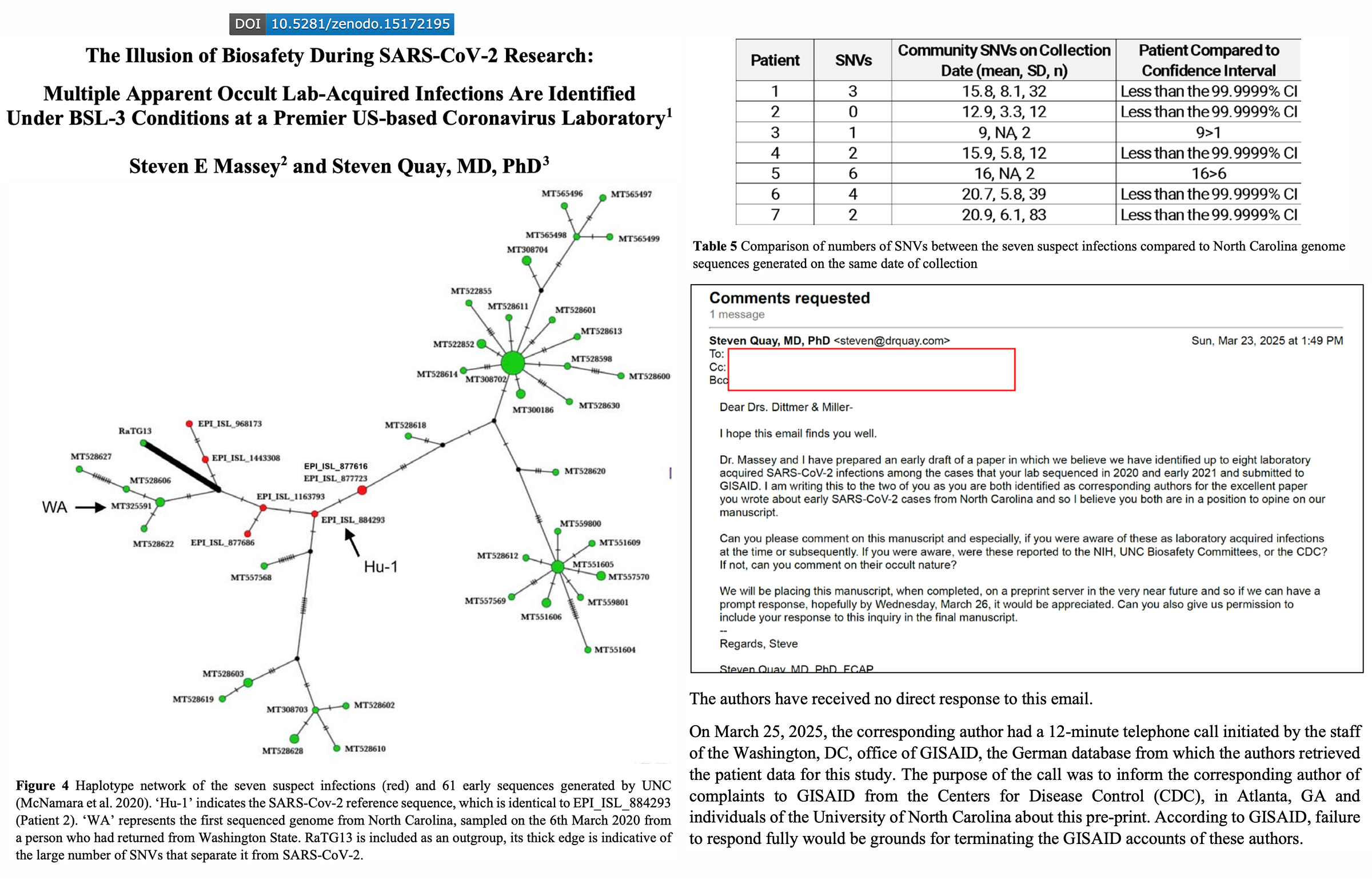 Dr. Peter McCullough MD - Apr 17th 2025 4:10pm EDT By Nicolas Hulscher, MPH The study authored by Drs. Steven Massey and Steven Quay titled “The Illusion of Biosafety During SARS-CoV-2 Research: Multiple Apparent Occult Lab-Acquired Infections Are Identified Under BSL-3 Conditions at a Premier US-based Coronavirus Laboratory” was just uploaded to the Zenodo preprint server. The study identifies seven laboratory-acquired infections (LAIs) with SARS-CoV-2, […]