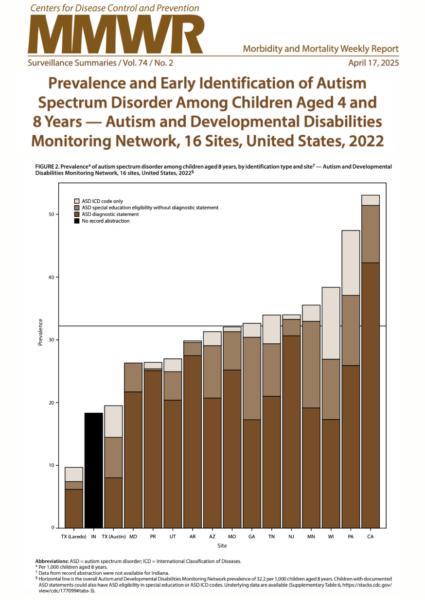 Dr. Peter McCullough MD - Apr 15th 2025 4:25pm EDT by Nicolas Hulscher, MPH The CDC surveillance study titled “Prevalence and Early Identification of Autism Spectrum Disorder Among Children Aged 4 and 8 Years — Autism and Developmental Disabilities Monitoring Network, 16 Sites, United States, 2022” was just published on the Morbidity and Mortality Weekly Report (MMWR). They found the following concerning statistic: Results: Among […]