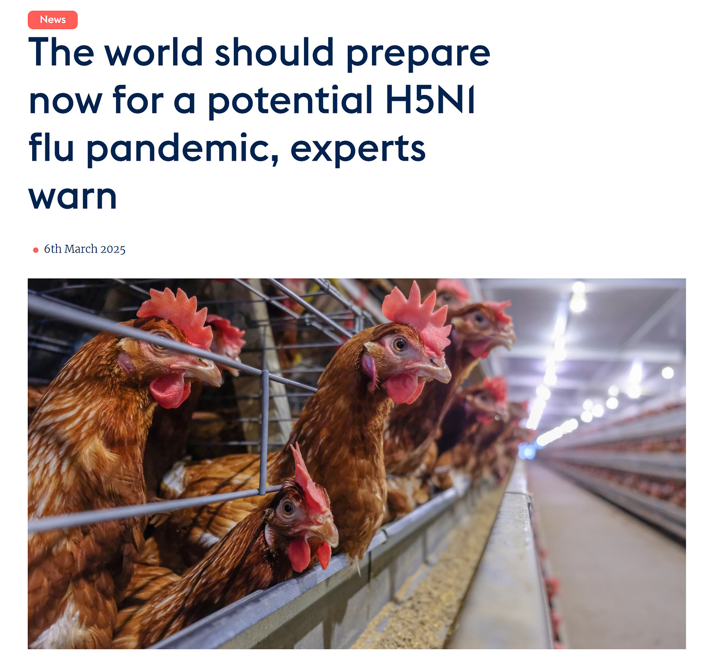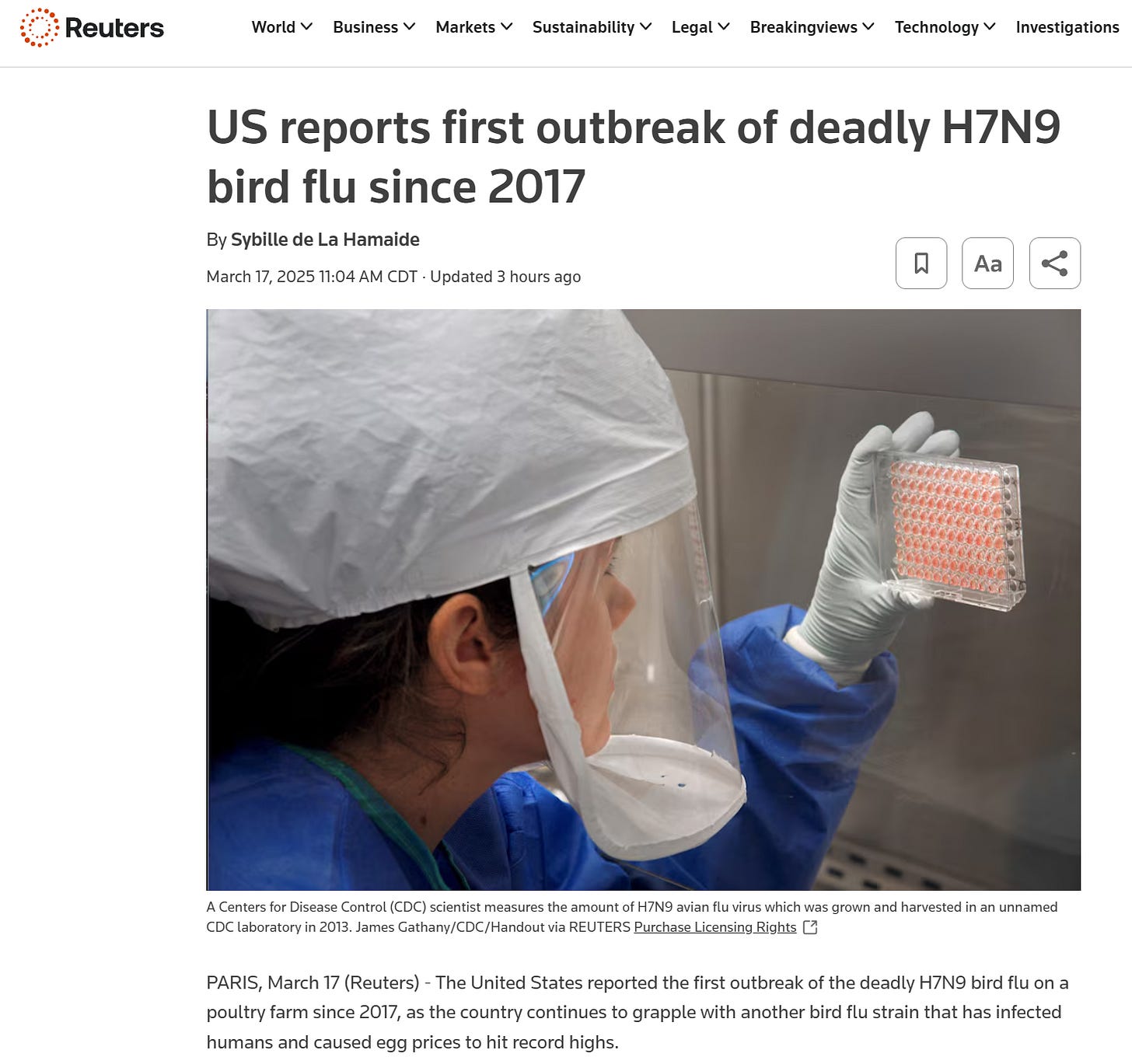 Dr. Peter McCullough MD - Mar 17th 2025 5:45pm EDT by Nicolas Hulscher, MPH According to a report by USDA APHIS, On March 12, APHIS confirmed the presence of highly pathogenic avian influenza (HPAI) H7N9 in a broiler chicken breeder flock in Mississippi. APHIS has previously documented H7 low pathogenicity avian influenza (LPAI) in U.S. wild bird surveillance this year and in previous years, but […]