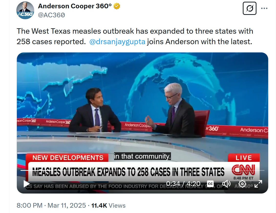 Dr. Peter McCullough MD - Mar 13th 2025 5:37am EDT By Peter A. McCullough, MD, MPH I watched a segment where Anderson Cooper interviewed his medical correspondent, neurosurgeon Dr. Sanjay Gupta on CNN concerning measles. I watched Gupta in the most genteel manner mislead the country on many aspects of the measles situation. First he made it seem as if all 258 cases (March 11, […]