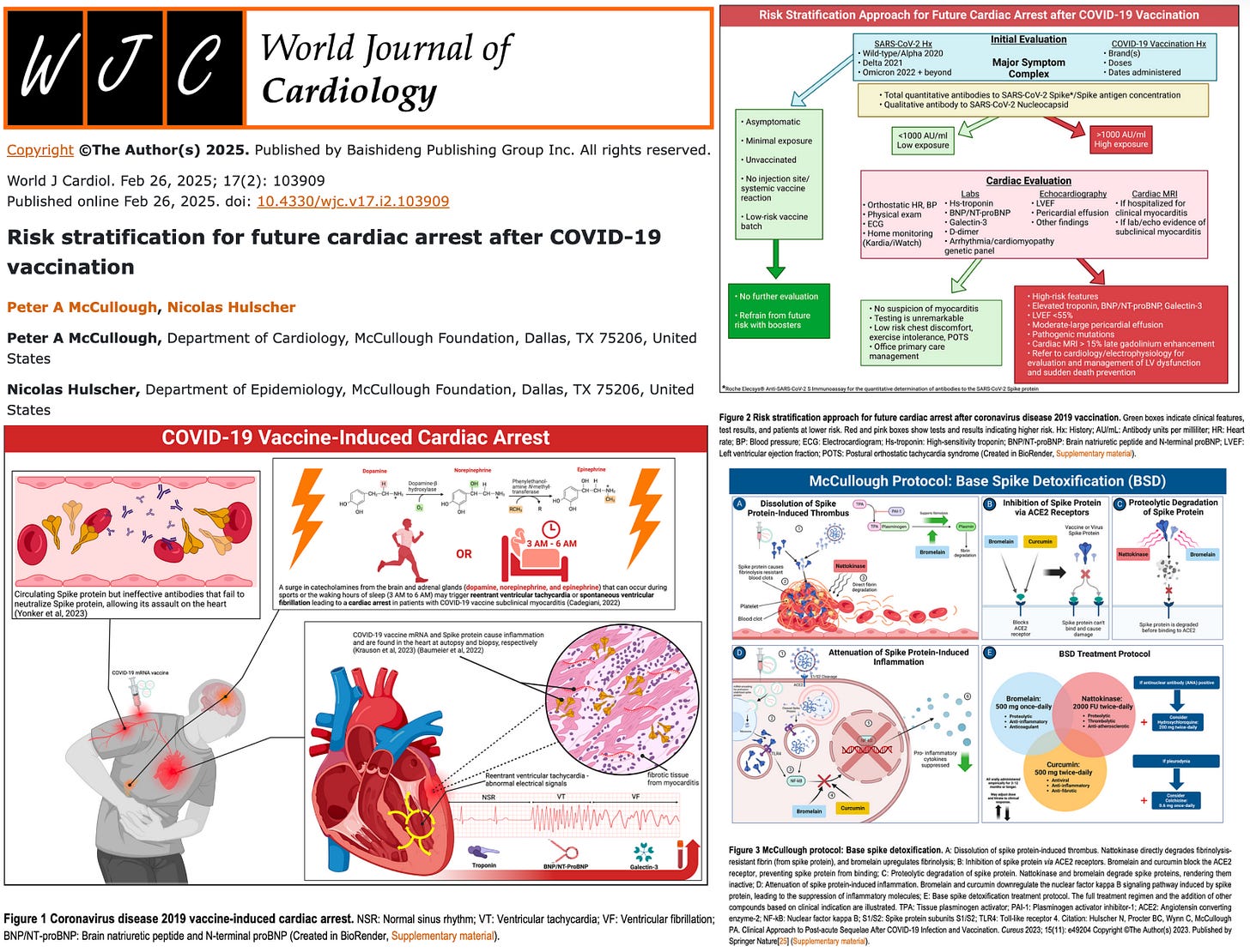 Dr. Peter McCullough MD - Feb 26th 2025 12:28pm EST by Nicolas Hulscher, MPH, and Peter A. McCullough, MD, MPH The study authored by cardiologist Dr. Peter McCullough and epidemiologist Nicolas Hulscher titled, Risk stratification for future cardiac arrest after COVID-19 vaccination, has been published after successful peer-review in the World Journal of Cardiology: Abstract Unheralded cardiac arrest among previously healthy young people without antecedent […]