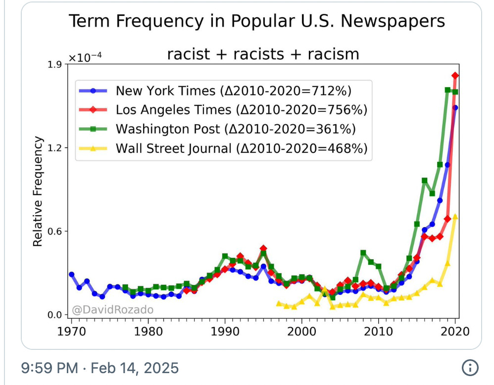 Dr. Peter McCullough MD - Feb 23rd 2025 11:59am EST The following chart plots America’s bizarre obsession with racism, which germinated around 2010, shortly after Barack Obama was elected POTUS. Note that this obsession became a social contagion long after racism ceased being a socially acceptable belief or sentiment. This is reminiscent of Tocqueville’s observation that bourgeois hatred for the French Ancient Regime fanned into […]