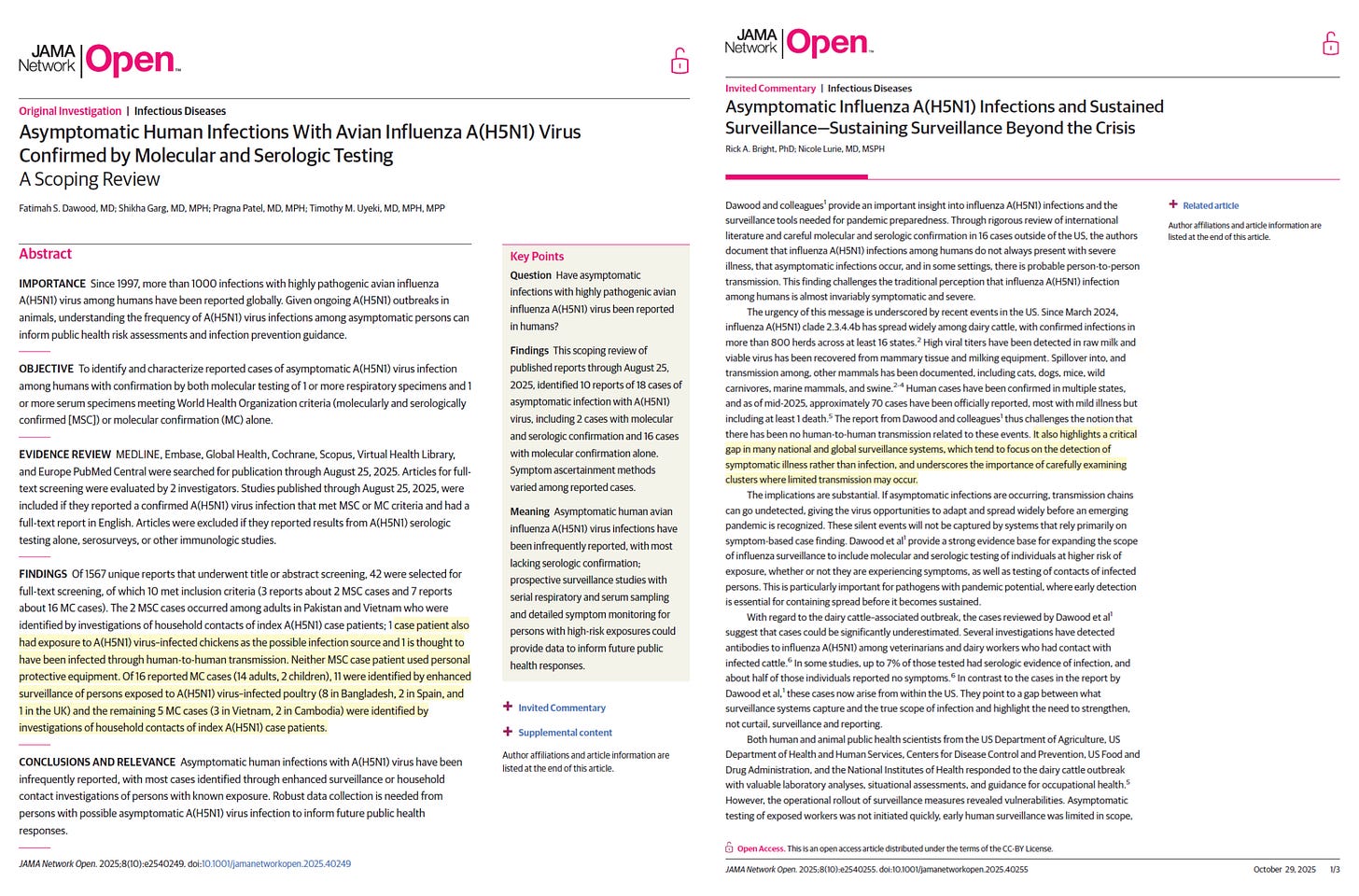 Dr. Peter McCullough MD - Nov 6th 2025 5:31am EST By Peter A. McCullough, MD, MPH A recent report from Dawood et al reported on very rare PCR positive H5N1 human cases. In an accompanying editorial, former BARDA director Rick Bright who fought against early SARS-CoV-2 treatment, is calling for mass PCR testing of animal workers. Dawood FS, Garg S, Patel P, Uyeki TM. Asymptomatic […]
