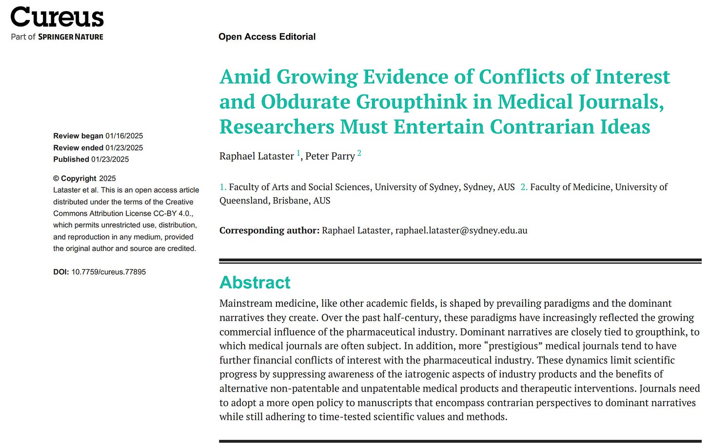 Dr. Peter McCullough MD - Jan 24th 2025 4:58pm EST by Nicolas Hulscher, MPH The editorial by Drs. Raphael Lataster and Peter Parry titled, Amid Growing Evidence of Conflicts of Interest and Obdurate Groupthink in Medical Journals, Researchers Must Entertain Contrarian Ideas, was just published: Abstract Mainstream medicine, like other academic fields, is shaped by prevailing paradigms and the dominant narratives they create. Over the […]