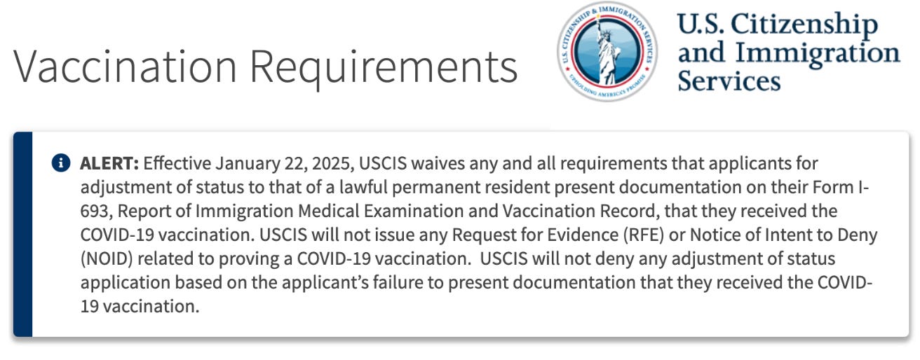 Dr. Peter McCullough MD - Jan 22nd 2025 4:04pm EST by Nicolas Hulscher, MPH A notice was just issued on the U.S. Citizenship and Immigration Services (USCIS) website that indicates the elimination of COVID-19 ‘vaccine’ mandates for legal immigrants: ALERT: Effective January 22, 2025, USCIS waives any and all requirements that applicants for adjustment of status to that of a lawful permanent resident present documentation […]