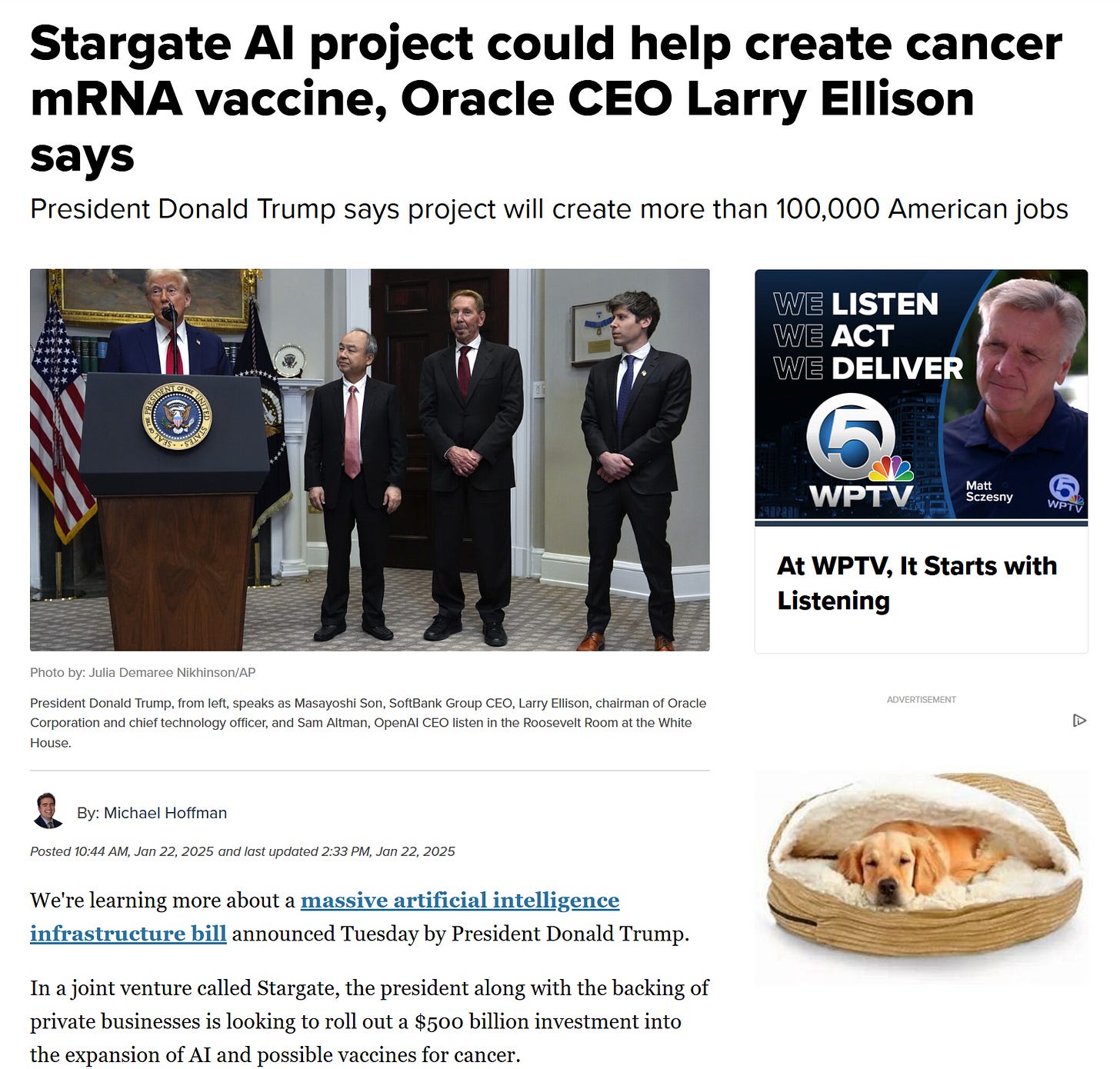 Dr. Peter McCullough MD - Jan 23rd 2025 9:09am EST By Peter A. McCullough, MD, MPH The medical world was stunned by the bold announcement of Project Stargate, a $500B investment in artificial intelligence promising >100,000 American jobs. The capper was Oracle CEO Larry Ellison painting a vision of using the technology to characterize a cancer and come up with an mRNA vaccine within 48 […]