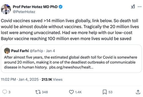 Dr. Peter McCullough MD - Jan 10th 2025 11:56am EST by Nicolas Hulscher, MPH Vaccine fanatic Peter Hotez has proven to be a so-called ‘misinformation superspreader’. Last week on X, he claimed the COVID-19 injections saved more than 14 million lives: To counter his absurd claims, I responded with the following: A few days ago, Peter Hotez published an opinion piece in PLOS Global Public […]