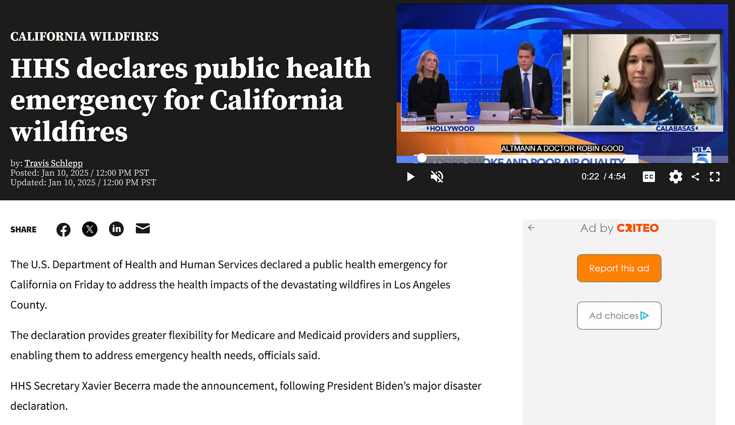 Dr. Peter McCullough MD - Jan 13th 2025 5:15am EST By Peter A. McCullough, MD, MPH The U.S. Department of Health and Human Services declared a public health emergency for California on Friday January 10, 2025 to address the health impacts of the devastating wildfires in Los Angeles County. The declaration provides greater flexibility for Medicare and Medicaid providers and suppliers, enabling them to address […]