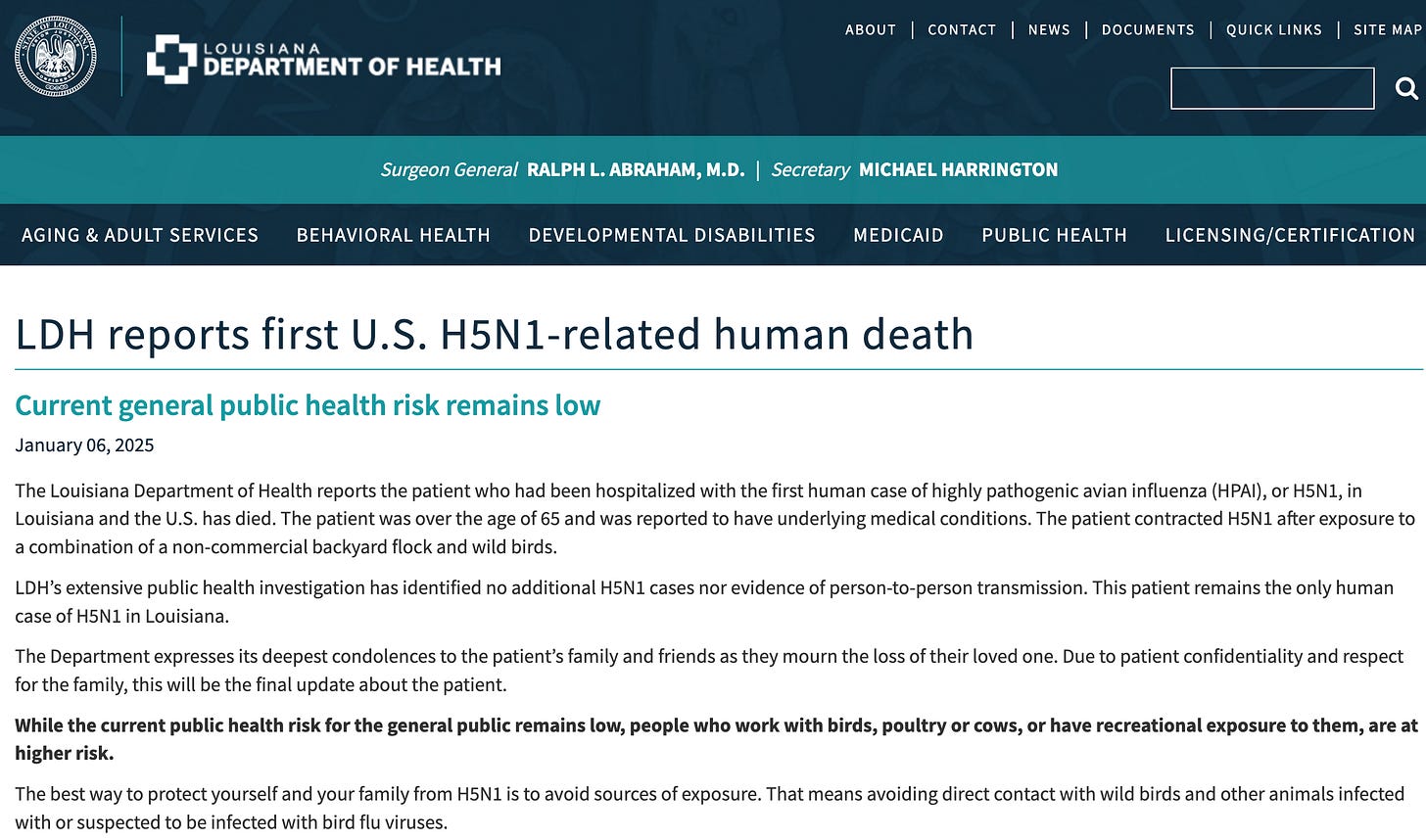 Dr. Peter McCullough MD - Jan 7th 2025 3:29pm EST Please enjoy my interview on Worldview Tube with Brannon Howse, where we discuss breaking public health developments: The first H5N1 bird flu death ever reported in the United States: The Louisiana Department of Health should release more details — This patient was over 65 years old with multiple underlying health conditions. It’s entirely possible that […]