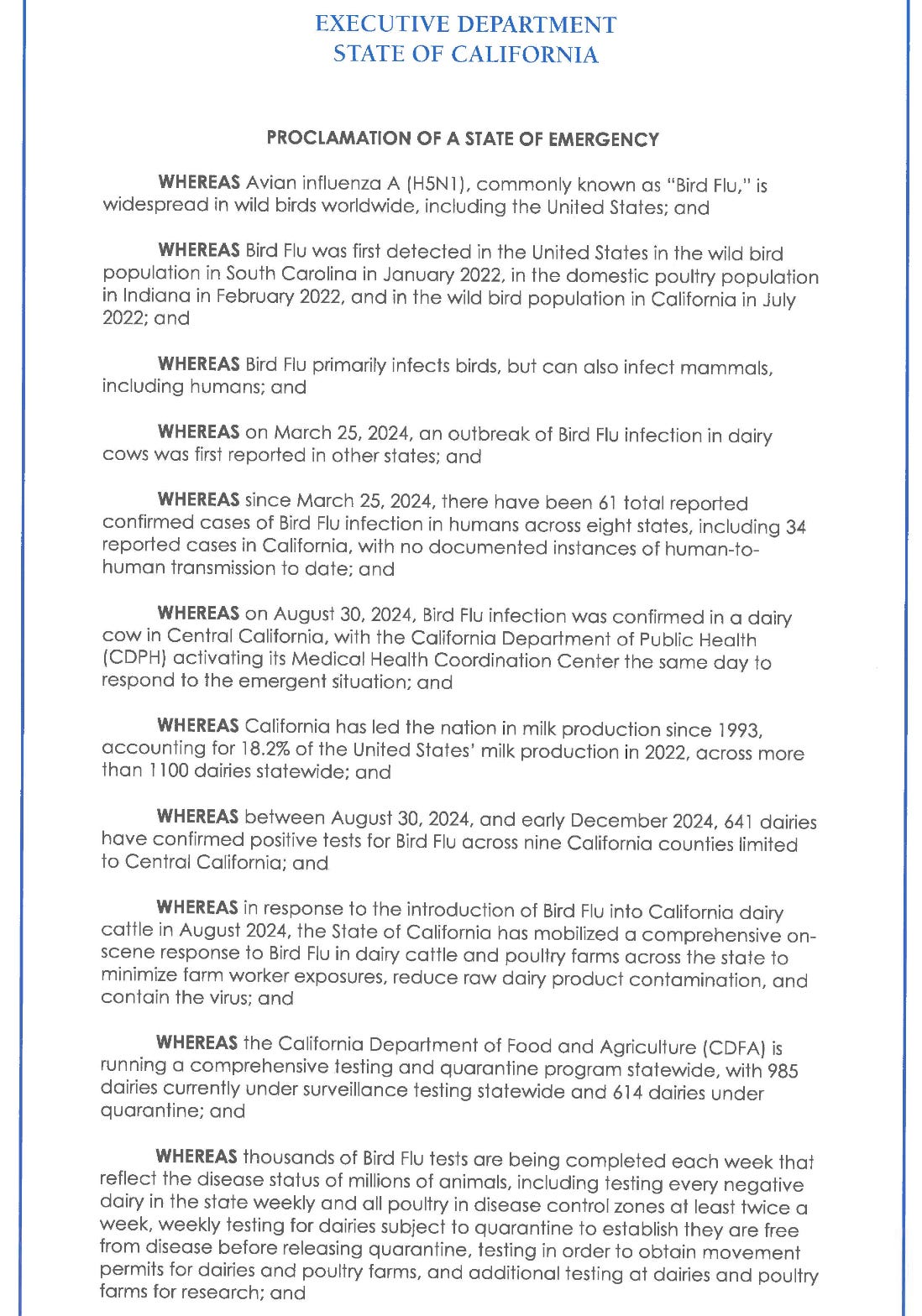 Ramifications of the California Bird Flu Emergency Declaration