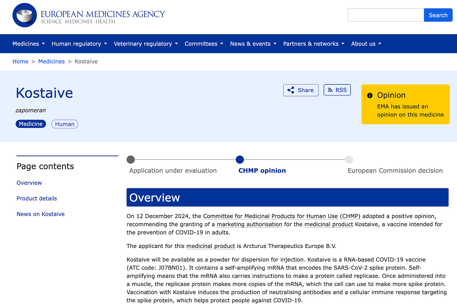 Dr. Peter McCullough MD - Dec 14th 2024 9:27am EST By Nicolas Hulscher, MPH On December 12, 2024, the Committee for Medicinal Products for Human Use (CHMP) issued a positive opinion recommending marketing authorization for Kostaive, a self-replicating (replicon) mRNA injection developed by Arcturus Therapeutics. The final decision for regulatory approval now rests with the European Commission: Here’s a visual representation of how these dangerous […]
