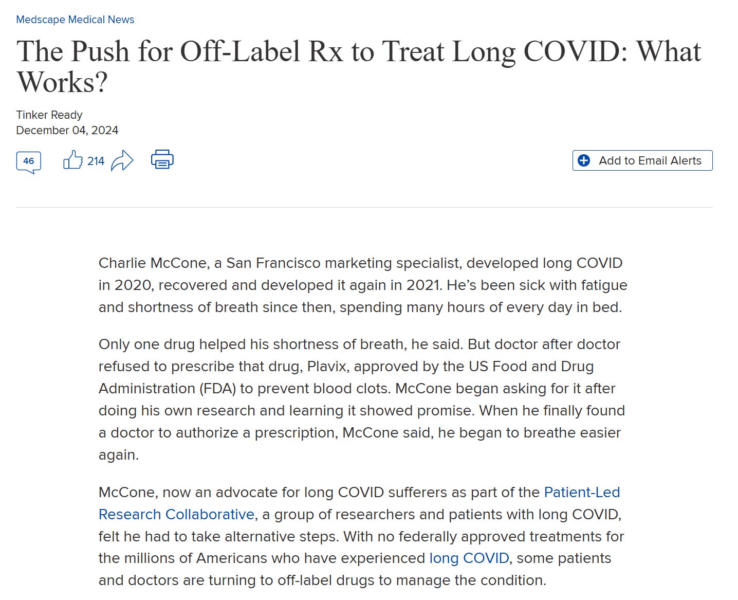 Dr. Peter McCullough MD - Dec 13th 2024 5:28am EST By Peter A. McCullough, MD, MPH Just as the public was misled during the acute phase of the SARS-CoV-2 outbreak with Medscape newsletters to doctors indicating no outpatient treatments were working, a similar dismal message hit the inboxes of America’s physicians in an article by Tinker Ready on long-COVID. The article quotes patient advocate Charlie […]