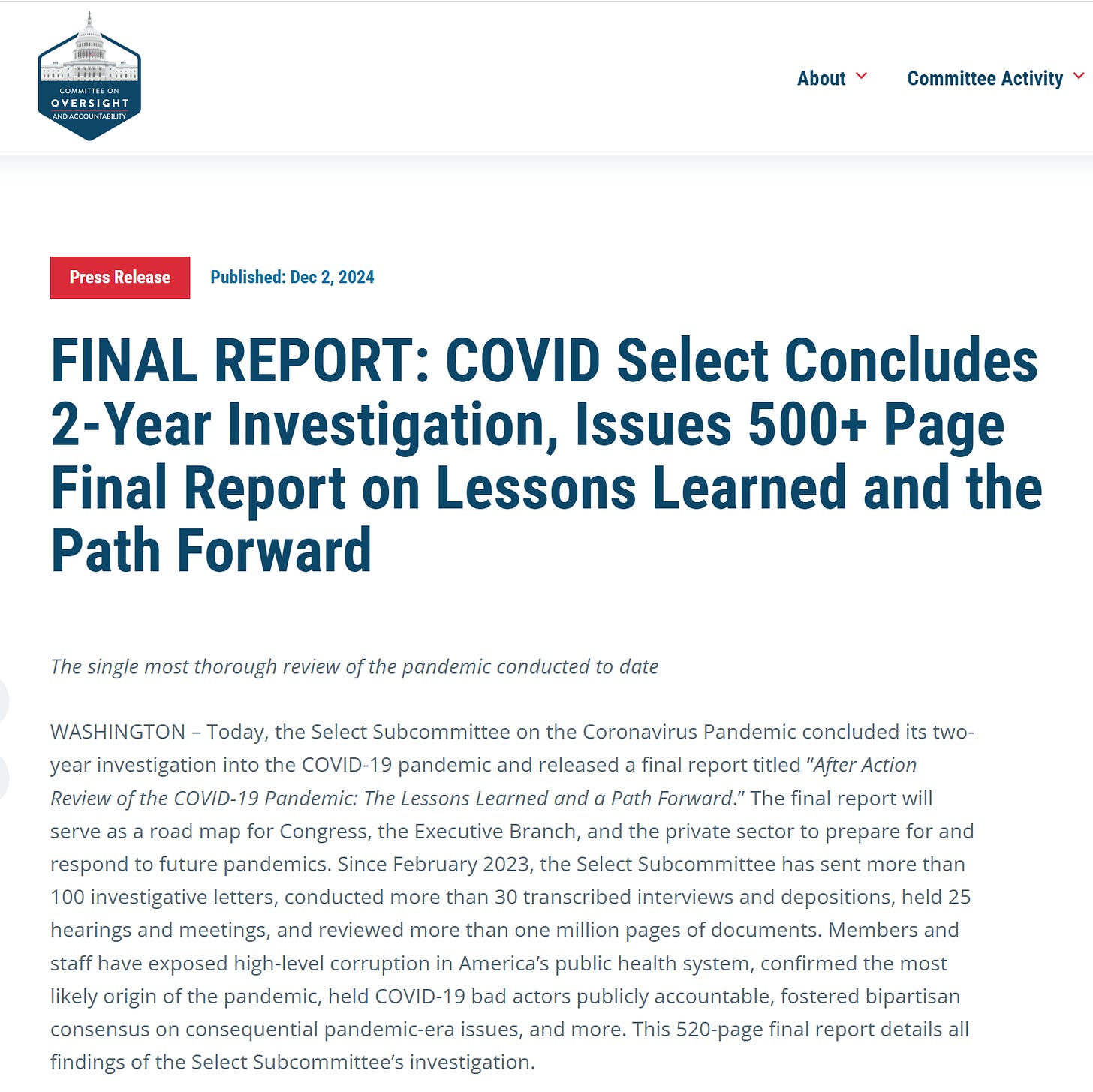 Dr. Peter McCullough MD - Dec 14th 2024 5:42am EST By Peter A. McCullough, MD, MPH On December 2, 2024, the Select Subcommittee on the Coronavirus Pandemic concluded its two-year investigation into the COVID-19 pandemic and released a final report titled “After Action Review of the COVID-19 Pandemic: The Lessons Learned and a Path Forward.” The 520 page document summarized numerous gross failures and evidence […]