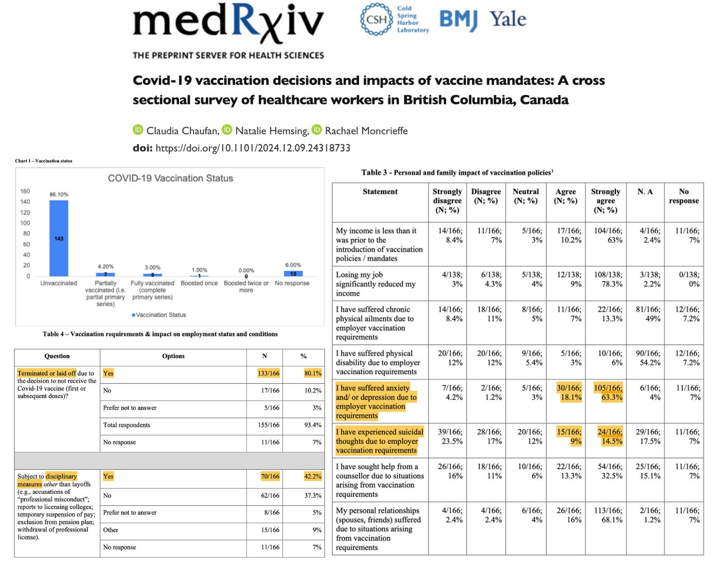 Dr. Peter McCullough MD - Dec 13th 2024 5:09pm EST by Nicolas Hulscher, MPH A new study by Chaufan et al, titled COVID-19 Vaccination Decisions and Impacts of Vaccine Mandates: A Cross-Sectional Survey of Healthcare Workers in British Columbia, Canada, has just been uploaded to the MedRxiv preprint server. They found that COVID-19 injection mandates took a massive toll on the well-being of healthcare workers: […]