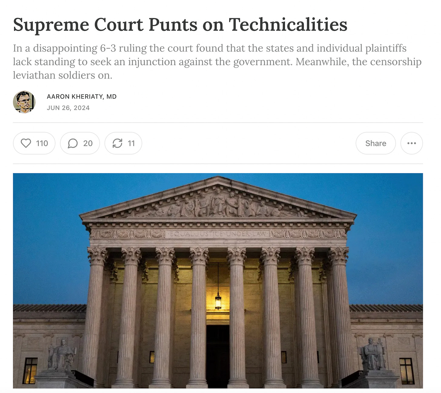 Dr. Peter McCullough MD - Jun 26th 2024 6:05pm EDTThis is a breaking story that will require followup with full legal analysis, but for now, the following is what we can say about the decision. Until recently, most American citizens assumed that the Executive Branch was barred by the First Amendment from directing (by means of telephone calls and e-mails) social media companies to […]