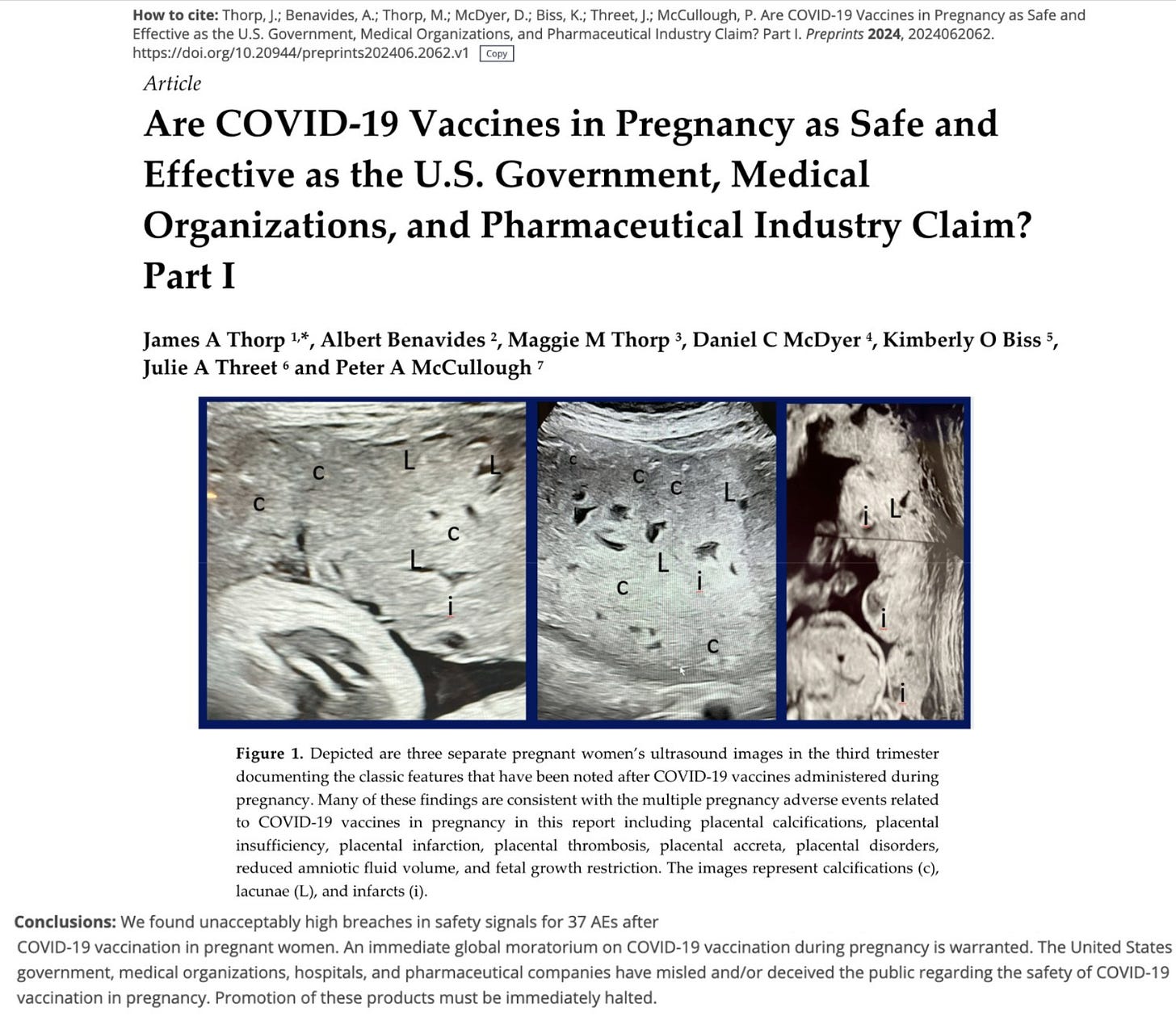 Dr. Peter McCullough MD - Jun 30th 2024 5:04am EDT Colleagues I am pleased to share this manuscript as the first in a three part series exposing the harms of COVID-19 to pregnant women, babies in the womb, and infants. The project was led by obstetrician/gynecologists Drs. James Thorp, Dr. Daniel McDyer, and Kimberly Biss. “The CDC/FDA’s safety signals were breached for all 37 AEs […]