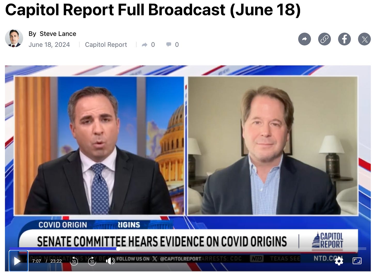 Dr. Peter McCullough MD - Jun 19th 2024 9:53pm EDT A conversation with NTD’s Steve Lance about the Senate Committee’s hearing on the origin of SARS-CoV-2. We also discuss the increasing incidence of myocarditis and the suppression of early treatment. My interview begins at 6:42 on the tape. Share