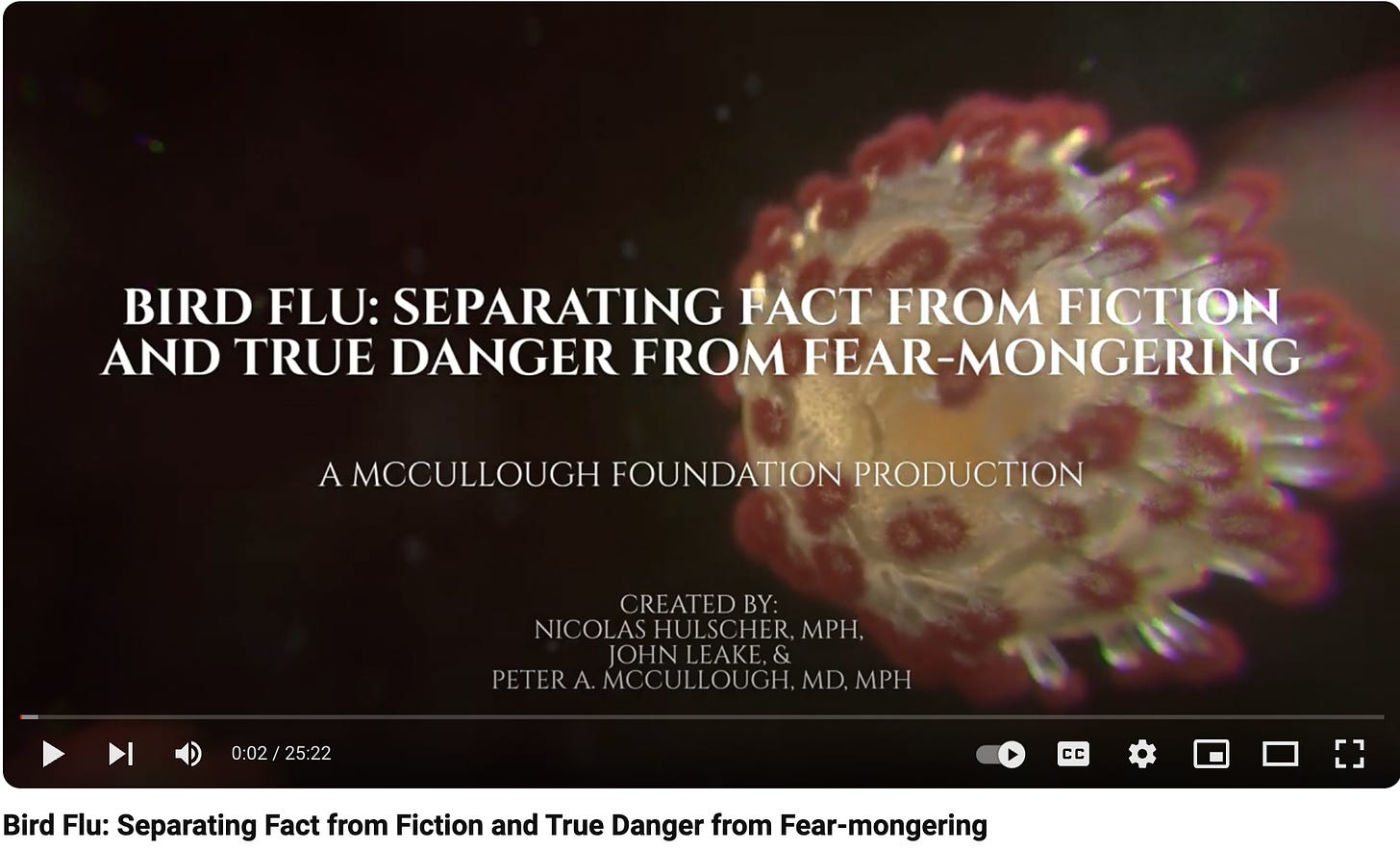 Dr. Peter McCullough MD - Jun 17th 2024 10:24pm EDT The McCullough Foundation has just produced a 25-minute video about the latest variant of highly pathogenic H5N1 avian influenza, and how the U.S. and E.U. governments are responding to it. We believe there is growing evidence that this variant of bird flu is becoming the “Disease X” the Bio-Pharmaceutical Complex has been warning about in […]