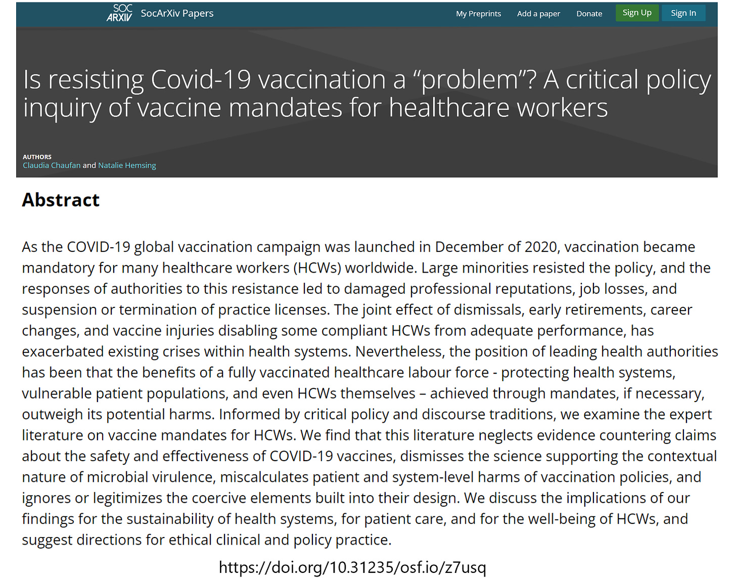 Dr. Peter McCullough MD - Mar 14th 2024 5:09am EDT By Peter A. McCullough, MD, MPH This paper caught my attention on the issue of COVID-19 vaccination in healthcare workers. Chaufan and Hemsing used a “What is the problem” framework to search the literature on this issue and understand the “dominant representations” of healthcare institutions. There conclusions were stunning from a social science perspective. “We […]