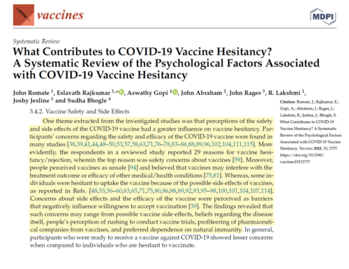 Dr. Peter McCullough MD - Mar 19th 2024 5:44am EDT By Peter A. McCullough, MD, MPH As of today, there are 7444 publications listed in PUBMED on the search term “vaccine hesitancy.” I wondered if COVID-19 vaccine hesitancy researchers had made any progress understanding this growing phenomenon. Romate et al performed a systematic review which included 79 studies that evaluated psychological determinants of COVID-19 vaccine […]