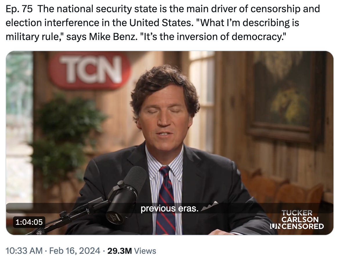 Dr. Peter McCullough MD - Feb 19th 2024 9:13am EST Tucker Carlson just interviewed former State Department official, Mike Benz, about how the National Security State—originally conceived to protect the American homeland from foreign adversaries—has increasingly directed its attention to controlling the American people. Its primary instrument is censorship. This is the exact opposite of what our Founding Fathers conceived for the USA. As James […]