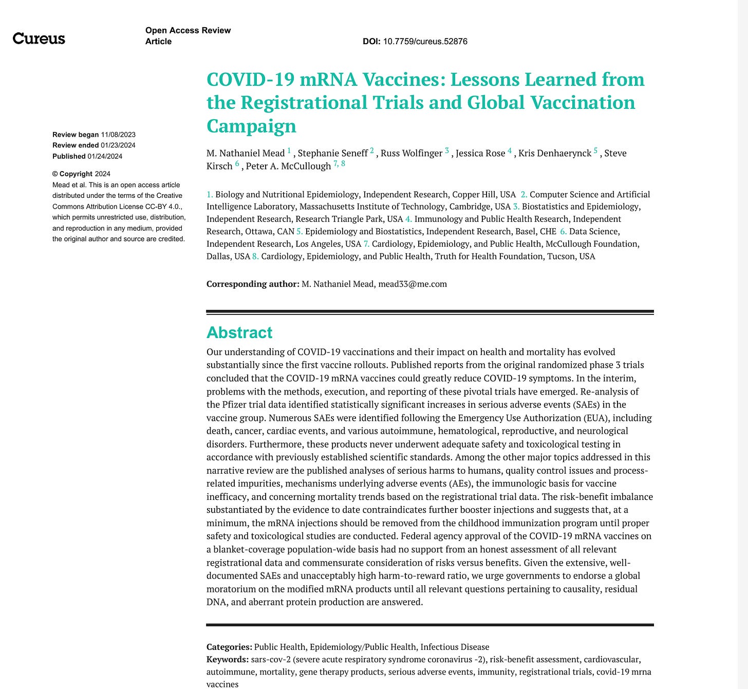 Dr. Peter McCullough MD - Feb 24th 2024 10:41am EST By Peter A. McCullough, MD, MPH In a stunning act of scientific censorship, a little known publication integrity staffer Tim Kersjes has retracted a manuscript authored by former NIH epidemiologist M. Nathanield Mead, MSc, after the paper drew global attention to the Springer Nature Cureus platform with record views/reads/downloads. The paper called for a halt […]