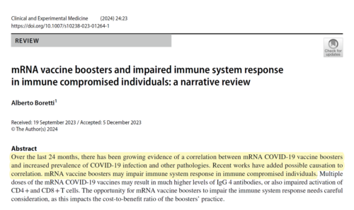 Dr. Peter McCullough MD - Feb 14th 2024 5:49am EST By Peter A. McCullough, MD, MPH One of the most visible categories of immunocompromised patients we have in clinical practice are those who have undergone organ transplantation, most commonly kidney and heart. A new analysis published suggests that continued boosters are weakening the immunity of those on immunosuppressives and thus allowing more not less COVID-19 […]