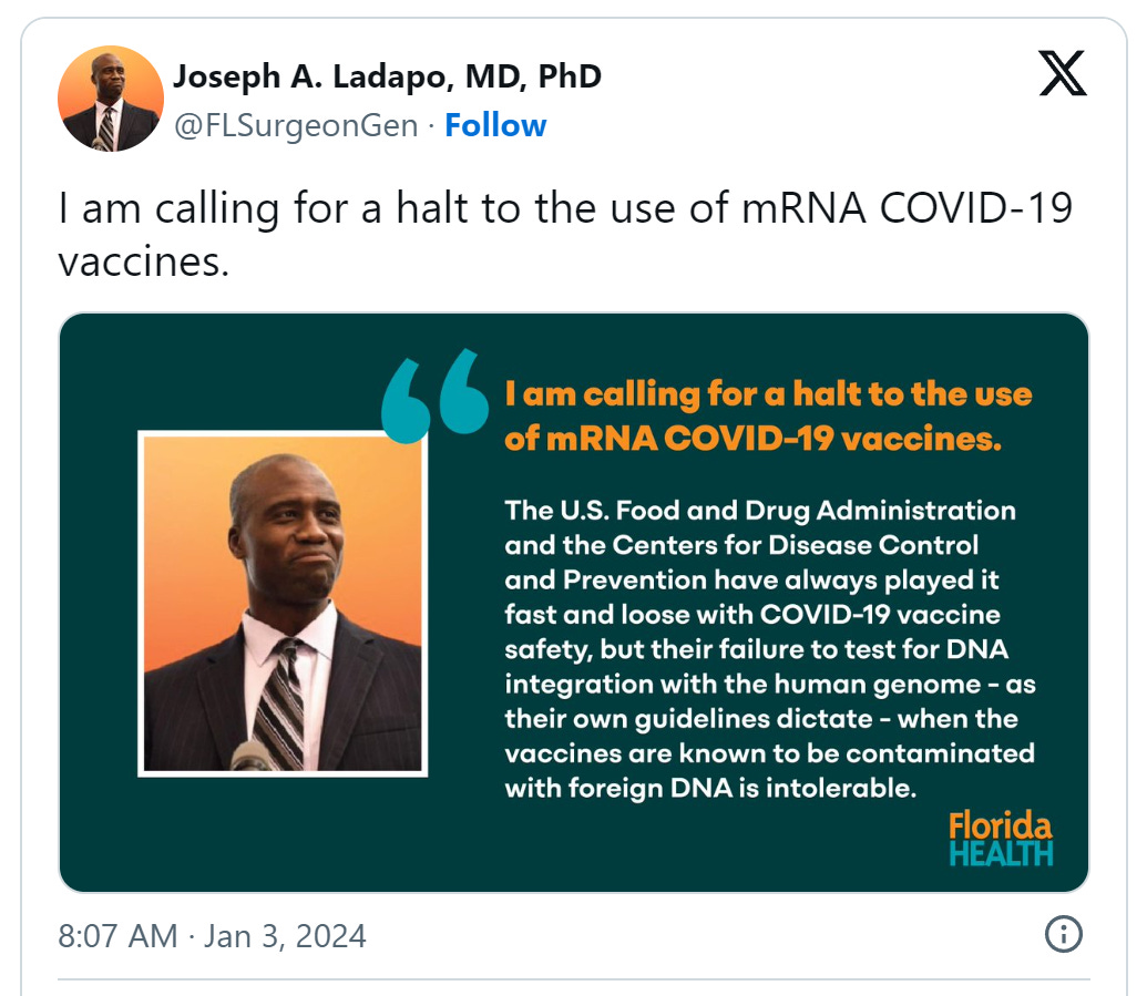 Dr. Peter McCullough MD - Jan 3rd 2024 4:19pm EST By Peter A. McCullough, MD, MPH Dr. Joseph A. Ladapo is a Harvard-trained MD, PhD, and arguably one of the top experts on COVID-19 in the world. Prior to the Florida Surgeon General appointment, Dr. Ladapo was in academic practice at UCLA and published with myself, Dr. John McKinnon, and Dr. Harvey Risch on the […]