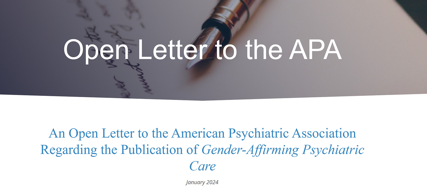 An Open Letter to the American Psychiatric Association Regarding the Publication of Gender-Affirming Psychiatric Care