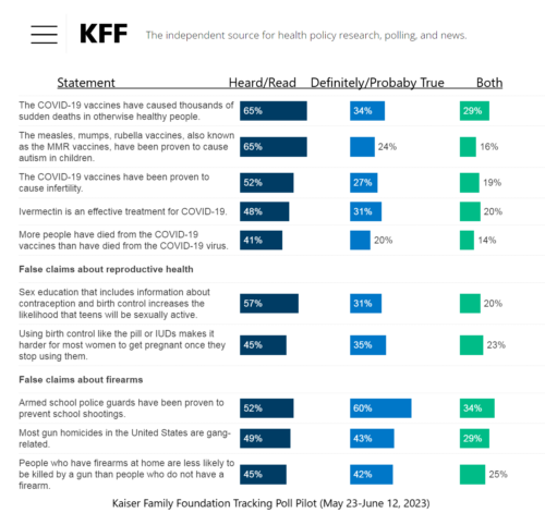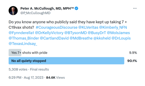 Dr. Peter McCullough MD - Aug 23rd 2023 8:56am EDT By Peter A. McCullough, MD, MPH The Kaiser Family Foundation is a pro-vaccine organization that has an biased polling system aimed at showing satisfaction and benefit of mass vaccination among other family issues. The May 23 through June 12, 2023 poll reveals some shocking new data. A substantial minority of Americans believe the COVID-19 vaccines […]