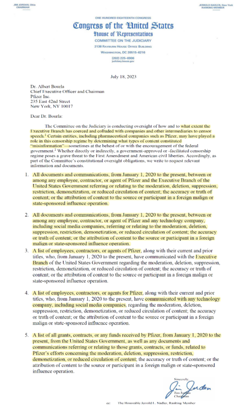 House Judiciary Letter to Pfizer CEO Bourla: Turn over Your Content Moderation Contacts and Documents
