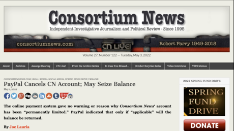 RT - May 5th 2022 2:56am EDT The payment platform appears to have reversed course after slapping Consortium News with a ‘permanent’ ban PayPal has released nearly $10,000 it seized from alternative media outlet Consortium News (CN), the site’s editor-in-chief said, allowing it to withdraw its funds after stating they could be held for up to six months without explanation. CN editor […]