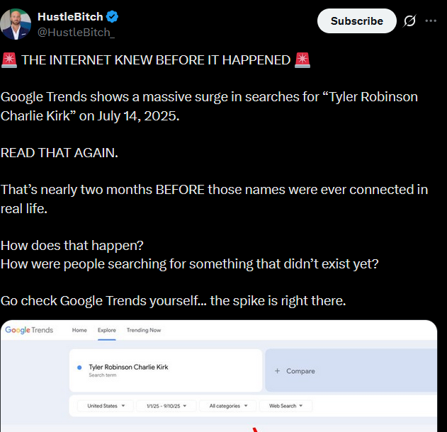 Ryan Dawson - Oct 14th 2025 4:42am EDT Here is something very basic. When you do research, always try to falsify your own position. Here we have a claim by Hustlebitch one of the Candace Owen’s super fans/coattail riders. OK this is simply not true. It is a manipulated graph. You can verify it your self by typing in Tyler Robinson Charlie Kirk […]