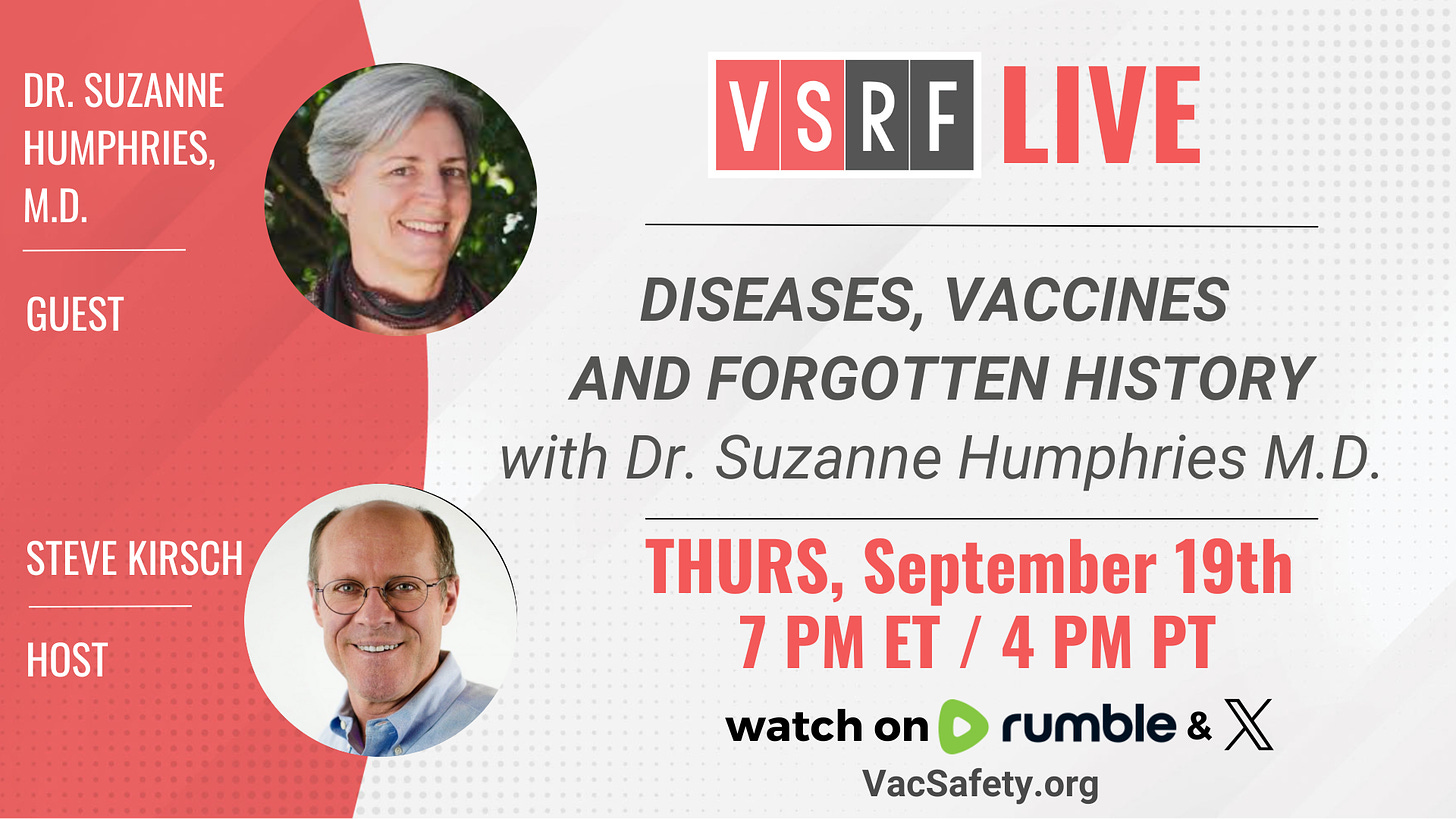 Steven Kirsch - Sep 19th 2024 10:39am EDT On this week’s VSRF LIVE I sit down with Dr. Suzanne Humphries, M.D. a licensed nephrologist, practicing in Maine and Virginia. Dr. Humphries is a co-author of Dissolving Illusions: Disease, Vaccines, and the Forgotten History. Additionally, Dr. Humphries has lectured extensively throughout Scandinavia, the USA and New Zealand on vaccines, holistic health, infant immunity, the […]