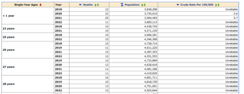 Steven Kirsch - Sep 3rd 2024 9:03pm EDT Executive summary VSRF’s Nurse Angela knows of 15 kids, under 20, who died from cardiac arrest. They were all vaccinated with the COVID vaccine. I did a CDC Wonder search for ICD-10 code I46 which is cardiac arrest. It shows that those under age 23 don’t die from cardiac arrest: Today, it is the new […]