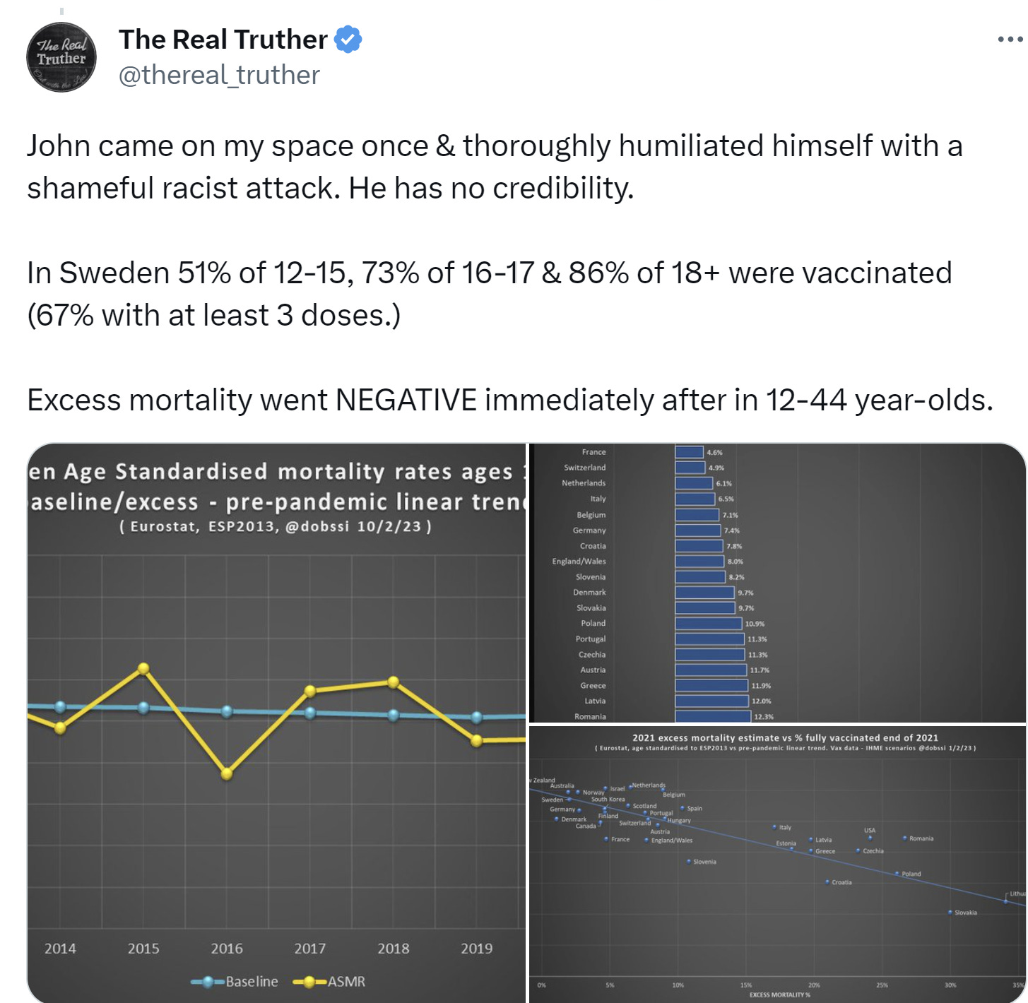 Executive summary When they can’t argue with your data, they will call you a racist (like thereal_truther did to my friend John Beaudoin), switch the topic to cherry picked data supporting their narrative (in this case switching from Massachusetts data to data from Sweden), or present misleading data and declare victory before waiting for the […]