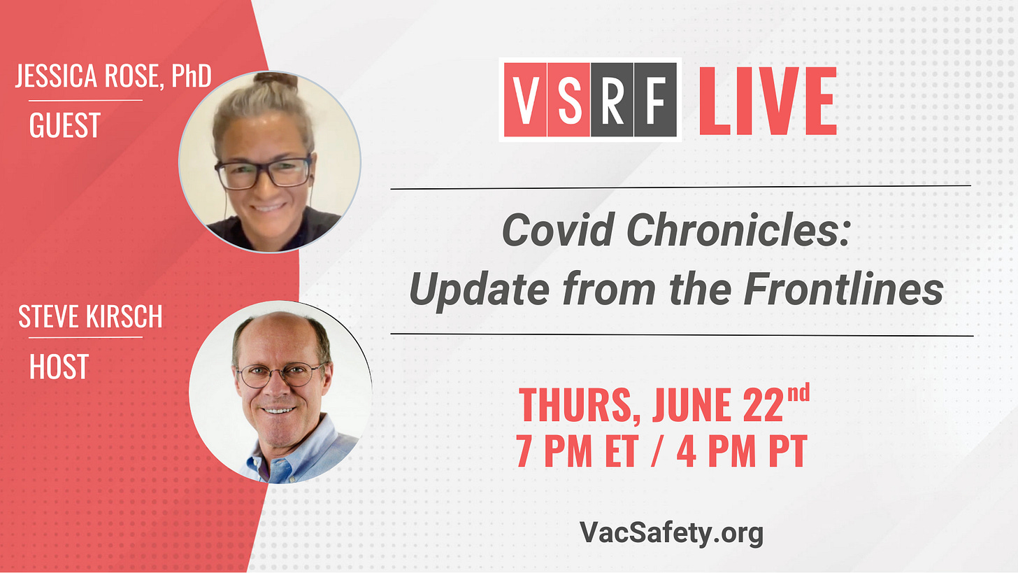 VSRF Weekly UpdateThursday, June 227pm Eastern | 4pm Pacific Register here to watch on ZoomOrLive stream on Rumble I am traveling this week, but I was very lucky to pre-record an interview with one of our favorite scientists, Dr. Jessica Rose, PhD. Dr. Rose hardly needs any introduction but it is important to remember that […]