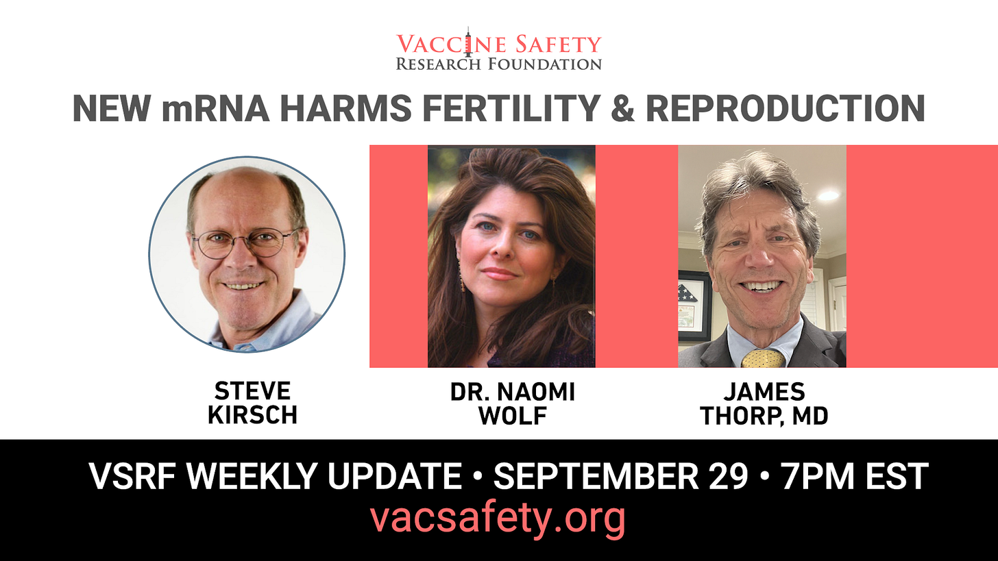 VSRF Weekly UpdateThursday, September 297pm Eastern / 4pm Pacific Register here to watch on ZoomOrLive stream on Rumble Watch the preview for this Thursday’s show with Dr. Naomi Wolf & Dr. James Thorp Our friend Dr. Naomi Wolf returns to the show this week to update us on the work she and her DailyClout team […]