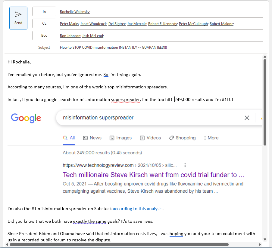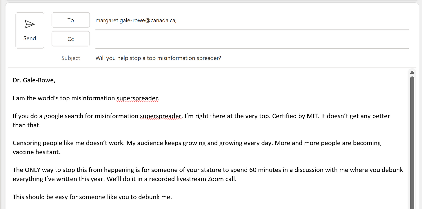 Here is her LinkedIn. Here’s the email I sent: Dr. Gale-Rowe, I am the world’s top misinformation superspreader. If you do a google search for misinformation superspreader, I’m right there at the very top. Certified by MIT. It doesn’t get any better than that. Censoring people like me doesn’t work. My audience keeps growing and […]