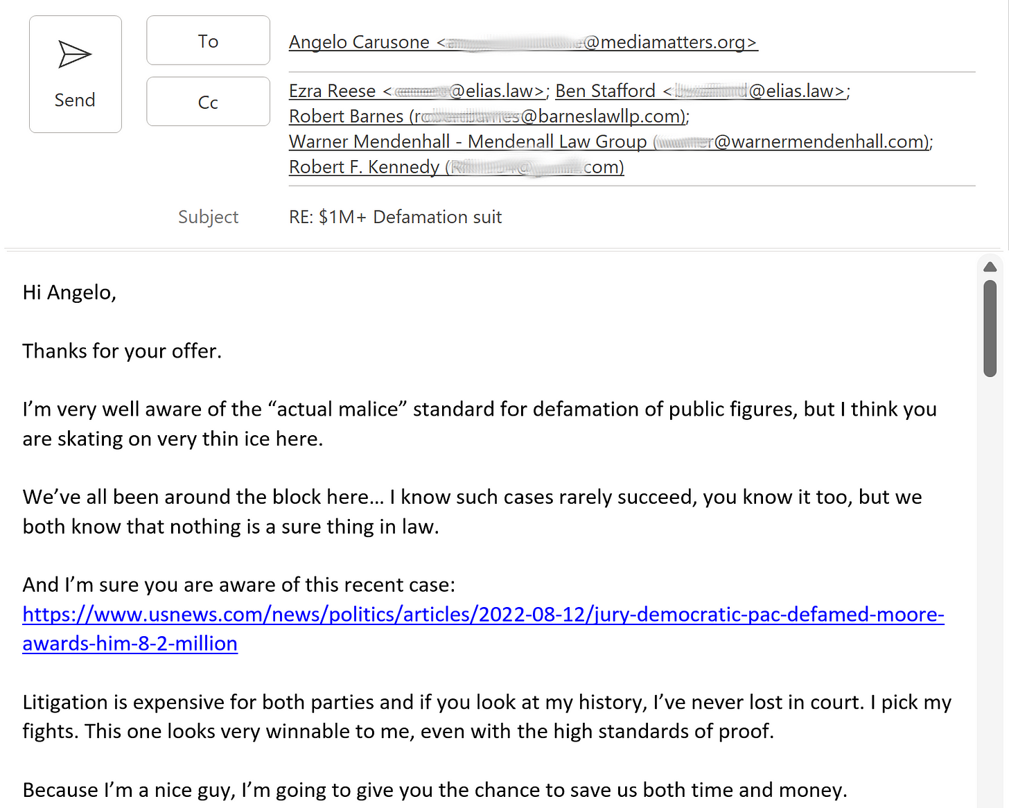 The CEO of Media Matters responded to my notice that I was going to sue them and offered to change “lied” to “falsely claims.” I didn’t accept. Instead, I wrote this: Here’s the full email Hi Angelo, Thanks for your offer. I’m very well aware of the “actual malice” standard for defamation of public figures, […]